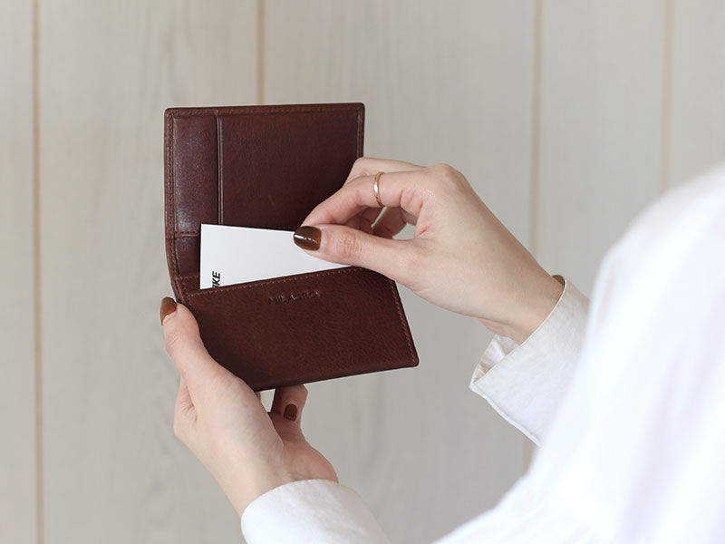 ビジネスシーンに欠かせないワードローブといえば名刺入れ。名刺交換の際に真っ先に相手に見られるアイテムの1つです。この名刺入れは、牛革にミリング加工を施した手触りの良い革を使用しています。また、かさばらず薄く持てる”笹マチ”と呼ばれる形が特長の名刺入れです。