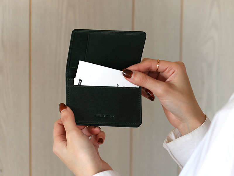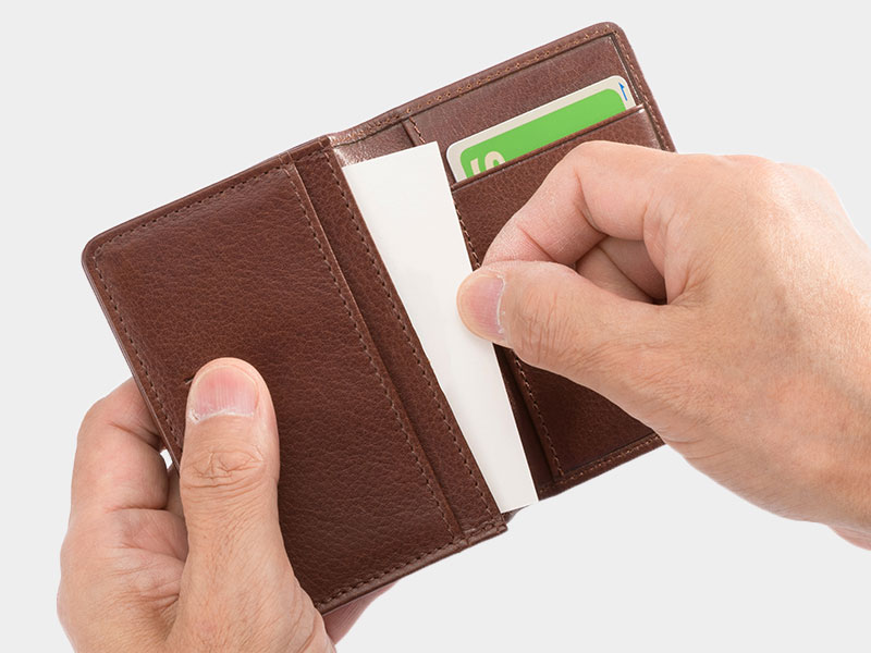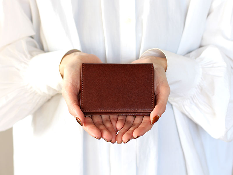 ビジネスシーンに欠かせないワードローブといえば名刺入れ。名刺交換の際に真っ先に相手に見られるアイテムの1つです。この名刺入れは、牛革にミリング加工を施した手触りの良い革を使用しています。また、かさばらず薄く持てる”通しマチ”と呼ばれる形が特長の名刺入れです。