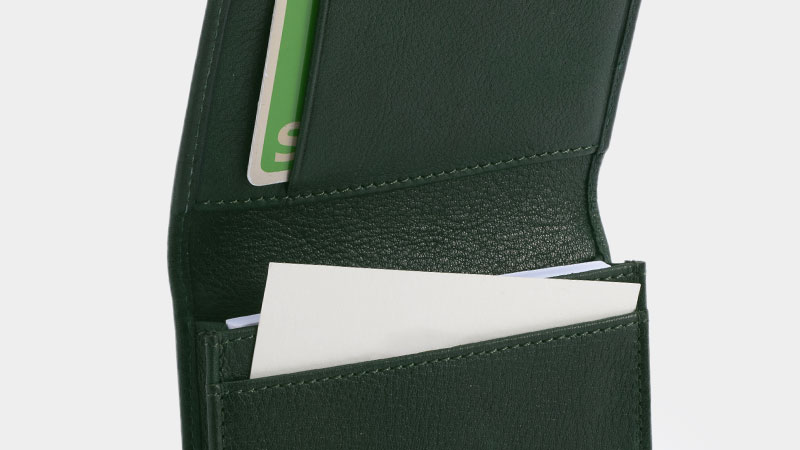 今回は、通しマチでなるべく薄く、スマートに持つことを目的として作りました。そして、収納部は風琴マチのようなデザインでマチ幅もあり、名刺の出し入れも便利です。また、内部にオープンポケット計2個付いているため、相手の名刺など一時的に保管するのに便利です。裏面にICカードを入れれば、自動改札でそのままタッチ&ゴーでスムーズに入出が可能なほか、タクシーでの支払い、コンビニでの会計などキャッシュレスで重宝する便利なポケットです。