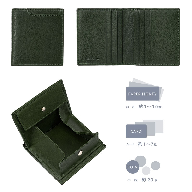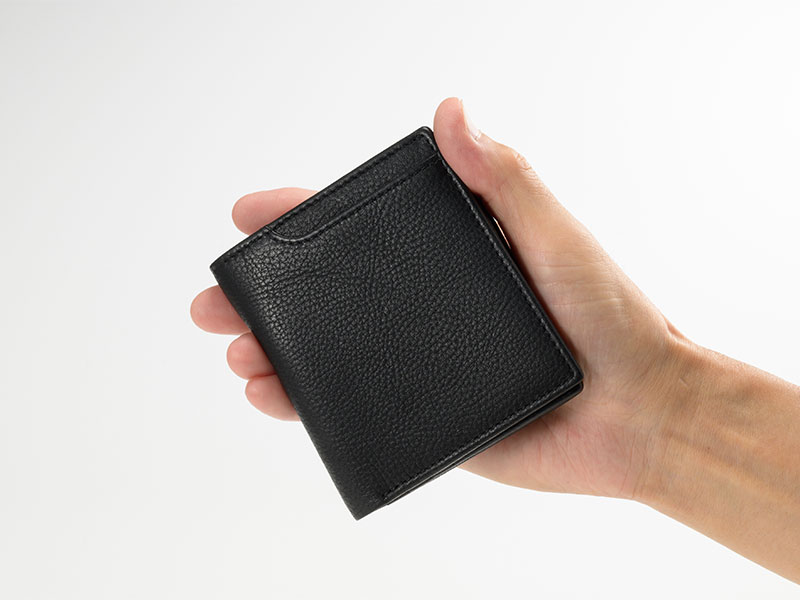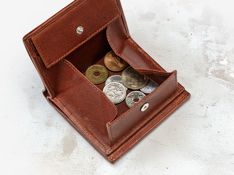 小銭入れは、ひと目で中身がわかり、取り出しやすいボックス型を採用しました。ホックを外すと、パッと箱型に立ち上がり、小銭が一目で見渡せるので、レジ前でも慌てずスムーズにお会計ができます。開口部が広く、奥に入った硬貨も取り出しやすいのが嬉しいポイントです。