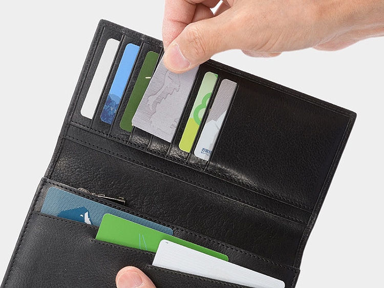 今まで長財布といえばかぶせ部分を上げるとカード段が横に2列あるため19.5cmという横幅のサイズが主流でした。このサイズは、横幅18cmなので横に2列は収納出来ません。よって、代わりに斜めに3枚のカードが収納できるようにスリットを入れることにより従来と比べても遜色のないように設計しました。また、被せにもカードポケットを7つ、札入れ内側にも2つ無駄なく配置しました。裏面にもオープンポケットがあり、レシートや領収書など一時的に保管するのにも便利です。