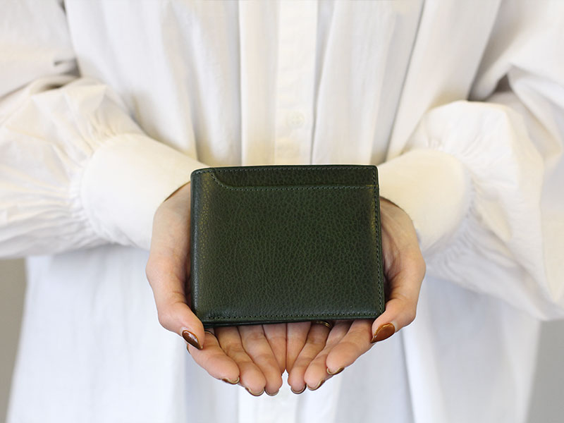 素材は牛革を使用。柔らかさとシワ感を出すためにミリング加工を施しました。90%植物性タンニンなめしされた半ヌメの牛革です。上品な仕上がりで、ブラック、ダークブラウン、グリーンの3色をご用意しました。
