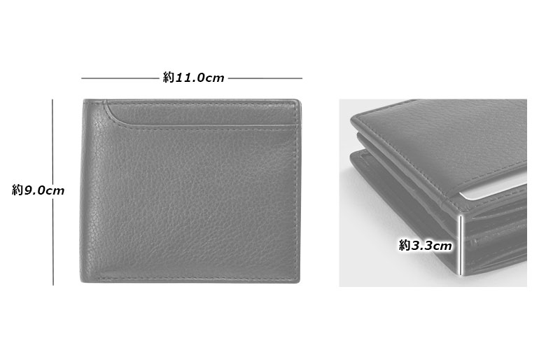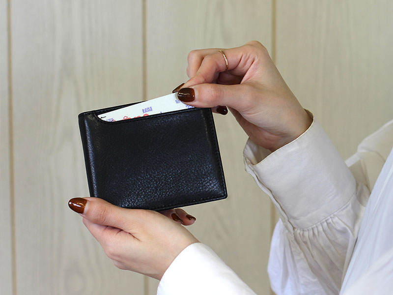 素材はしっとりした牛革を使用。2つ折りの中央に両サイドがカードポケットのベラが付いた収納力抜群の財布です。全体はコンパクトな作りで、仕切り付きの札入れとフラップ付きの小銭入れが付いています。厚みはベラの使い方で異なりますが、合計11個のカードポケットが付いた使い勝手抜群の財布です。