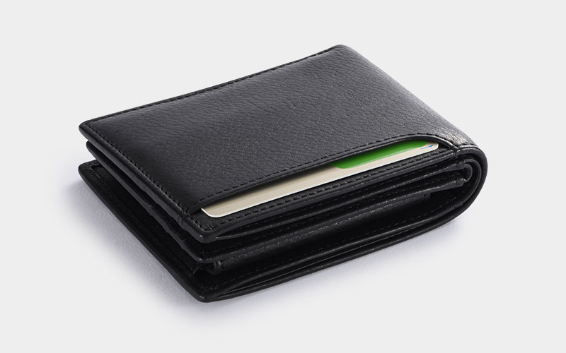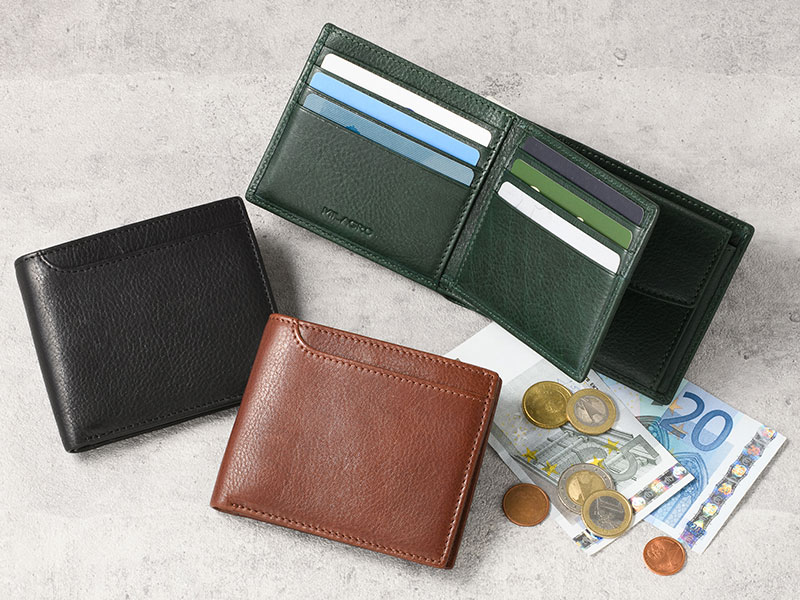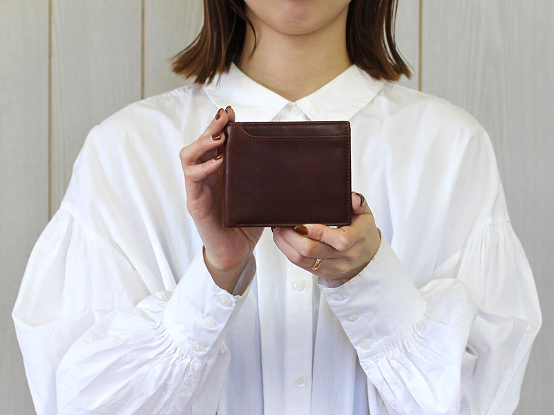 収納力抜群のベラ付きの2つ折り財布。柔らかさとシワ感を出すためにミリング加工を施した牛革を使用。