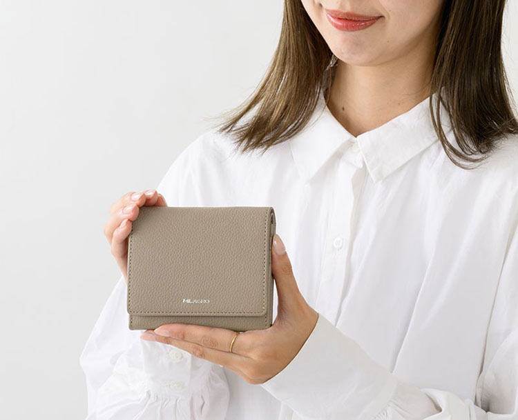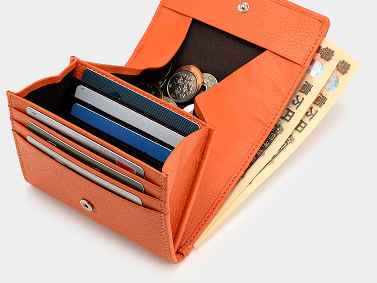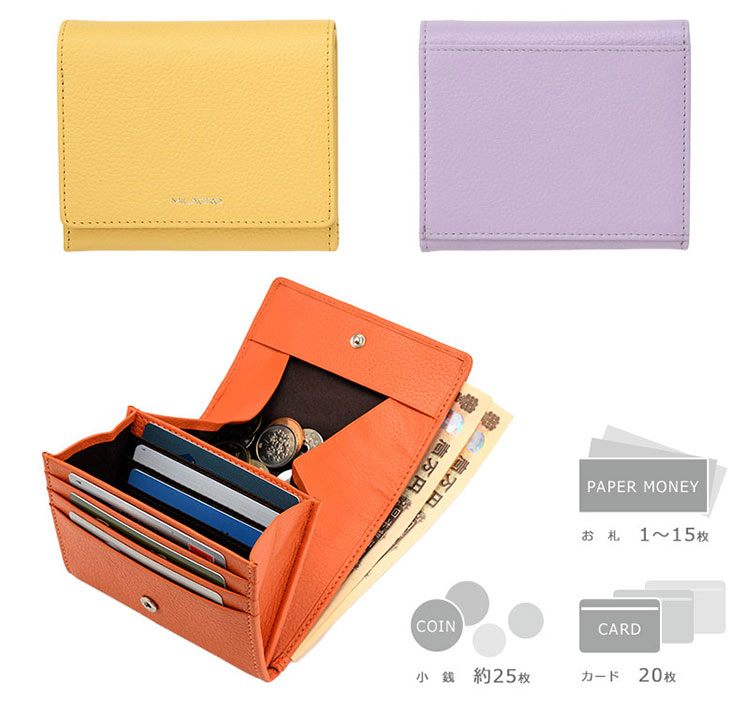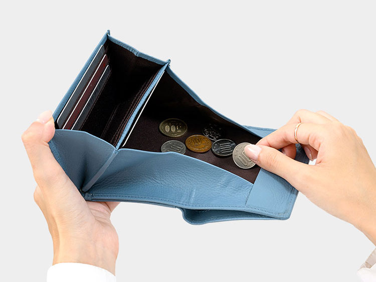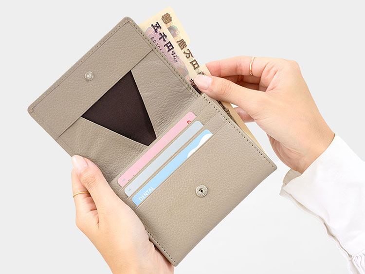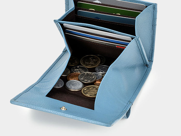 欧州の業務用財布からインスパイアされたカード多機能財布です。最大の特長はガバッと大きく開く小銭入れです。ひと目で小銭が確認でき、出し入れも便利です。ギャルソン財布といえば長財布が定番ですが、小さな手提げ等に入れても持ち運べるように2つ折り財布を企画しました。何より革が柔らかいので使いやすいです。 スナップボタンを開けて斜めに傾けると、小銭がフラップ部分まで広がり、パッと見渡せるだけでなく取り出しやすいようになっています。フラップ全体が札入れとなっているので、お札を折らずに収納出来ます。