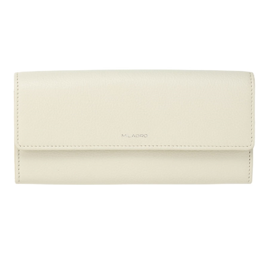 スナップボタンを開けて斜めに傾けると、小銭がフラップ部分まで広がり、パッと見渡せるだけでなく取り出しやすいようになっています。大容量の小銭入れのほかファスナーポケットをご用意しています。小銭の収納がどうしても心配な方や、失くしやすい細かいものなどを入れても安心です。また、ファスナーポケットが札入れの仕切りになっているので、お札も種類ごとに分類でき便利です。裏面にもオープンポケットがあり、レシートや領収書など一時的に保管するのにも便利です。引き手は、MILAGROオリジナルの引き手を使用しています。