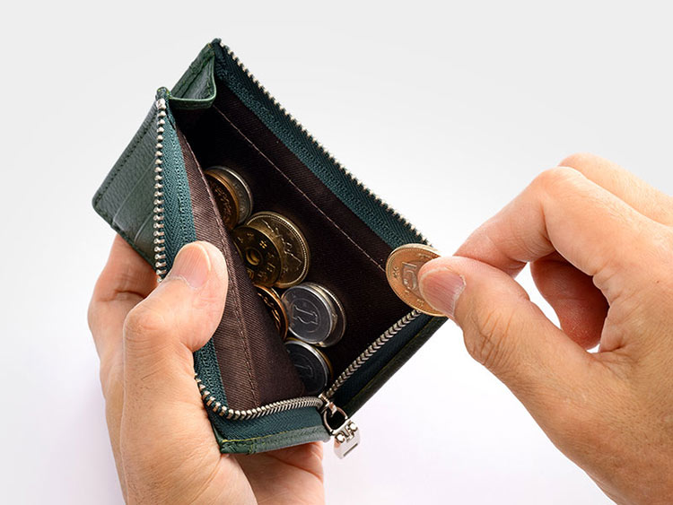 中央にはL字のファスナーポケットがついており、まとめたカード類や2つ折りした紙幣が10枚ほど収納可能です。中央のファスナーポケットは小銭入れとしても使用出来ます。L字型にファスナーがついているため、大きく開けることができ、中身が見やすく取り出しやすいです。さらに、マチがついていることで、ポケットの形状が安定し、中に入れたものによって形が崩れにくくなります。