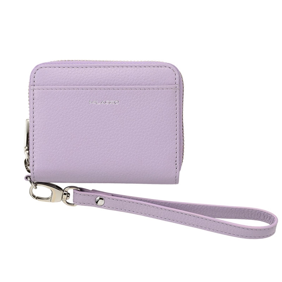 MILAGRO シュリンクレザー・ストラップ付き ラウンドジップ蛇腹カードウォレット・ラベンダー