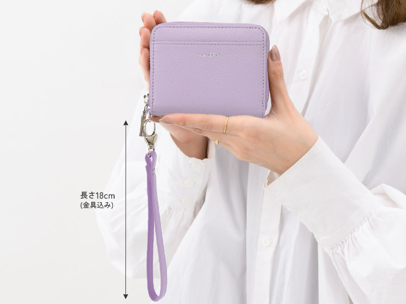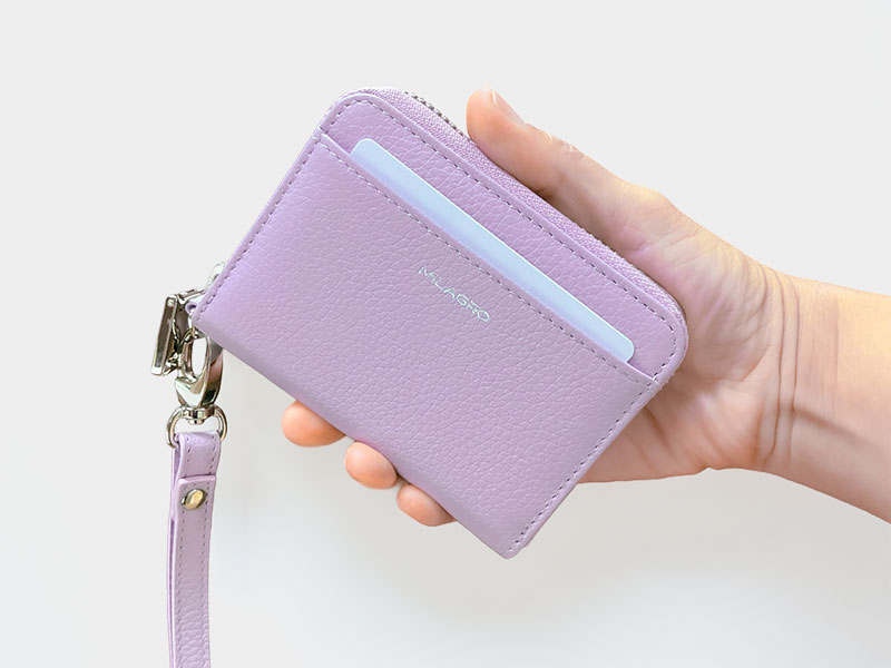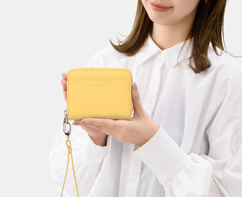 本体にDカンが付いており、ストラップの取り外しが可能です。ランチやコンビニなど、ちょっとした外出に便利でぶらぶらと手にぶら下げて持ち運びができます。バッグ要らずでお出掛けが出来て、旅行のサブ財布としても重宝します。引き手は、MILAGROオリジナルの引き手を使用しています。
