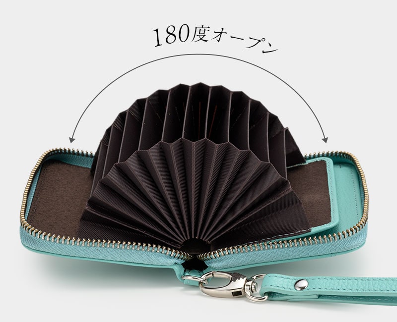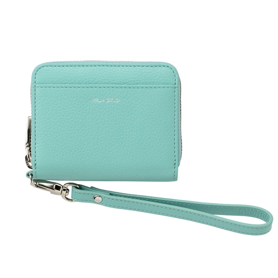 MILAGRO シュリンクレザー・ストラップ付き ラウンドジップ蛇腹カードウォレット・ミント