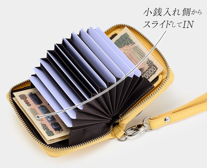 内側:カードポケット×10、BOX型小銭入れ×1、札入れ(スリップ式スペース)×1 付属品:取り外し可能ストラップ(長さ18cm:金具込み)