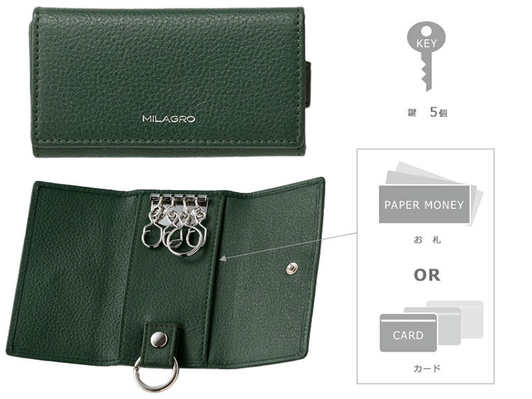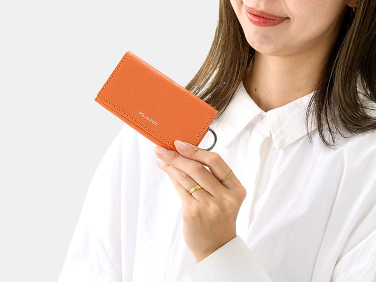 シンプルで細身の4連キーケースです。幅が約6cmと握りやすく持ちやすい形状で、パンツのポケットに入れても邪魔になりません。本体の下にはホックによる取り外し可能な2重リングが付いており、車のリモコンキーの収納に便利です。何より革が柔らかいので使いやすいです。
