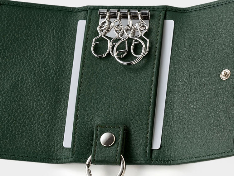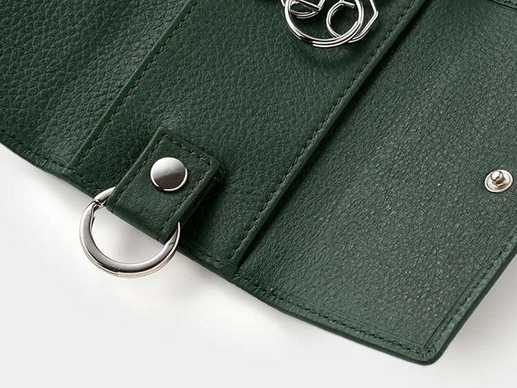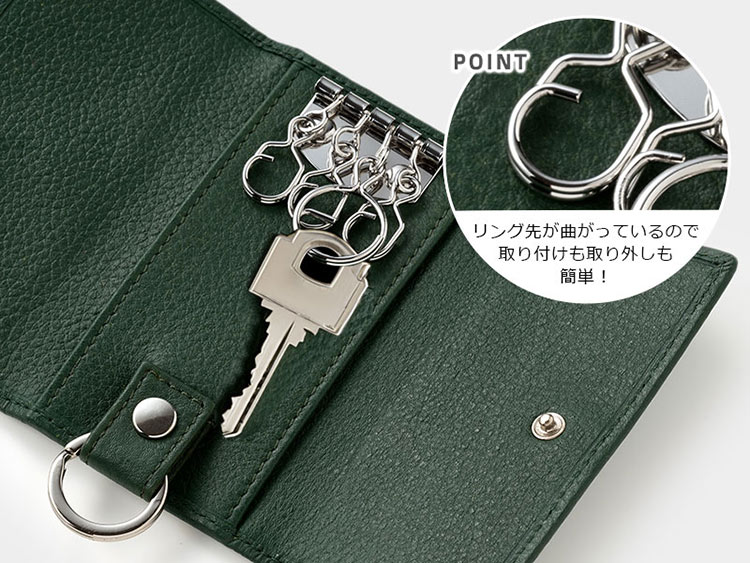 ボタン式のホックを開くと4連フックが付いています。取り外しがしやすく、鍵が外れにくい金具を採用しており、また大きめの鍵が付けられるように、大きいサイズのリングを一つ付けています。ETCカードやクレジットカードはキーリングの裏に挟む形で収納可能です。