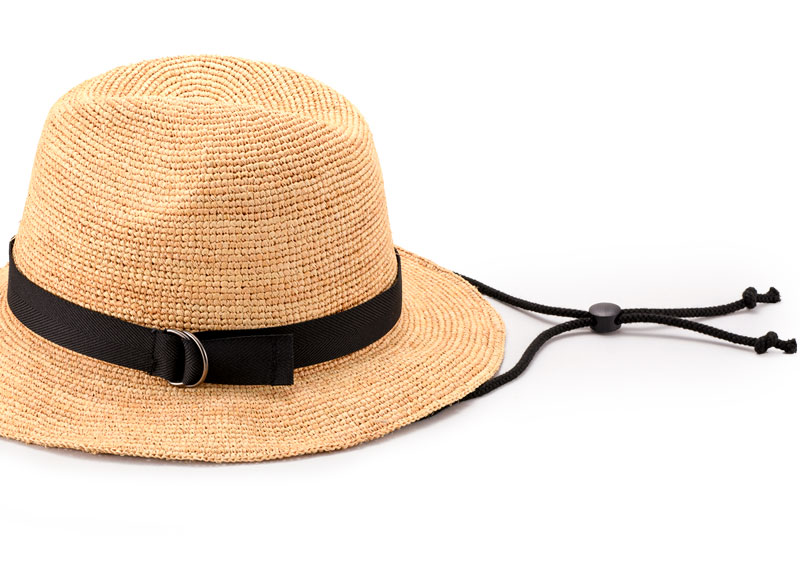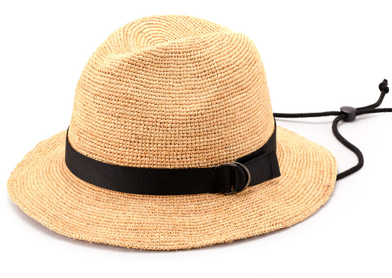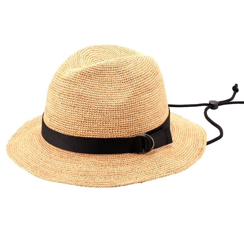 涼し気なラフィアの細編みで仕上げた中折れ帽子タイプのラフィアハット。 キャンプや海などのレジャーシーンはもちろん、タウンユースでもかぶれるデザイン。春夏の様々な場面で活躍します。 編んで仕上げることで帽子に通気性と柔軟性が備わり、快適なかぶり心地を提供します。 調節できるあご紐つきで、風が強い時もハットが飛ばされません。