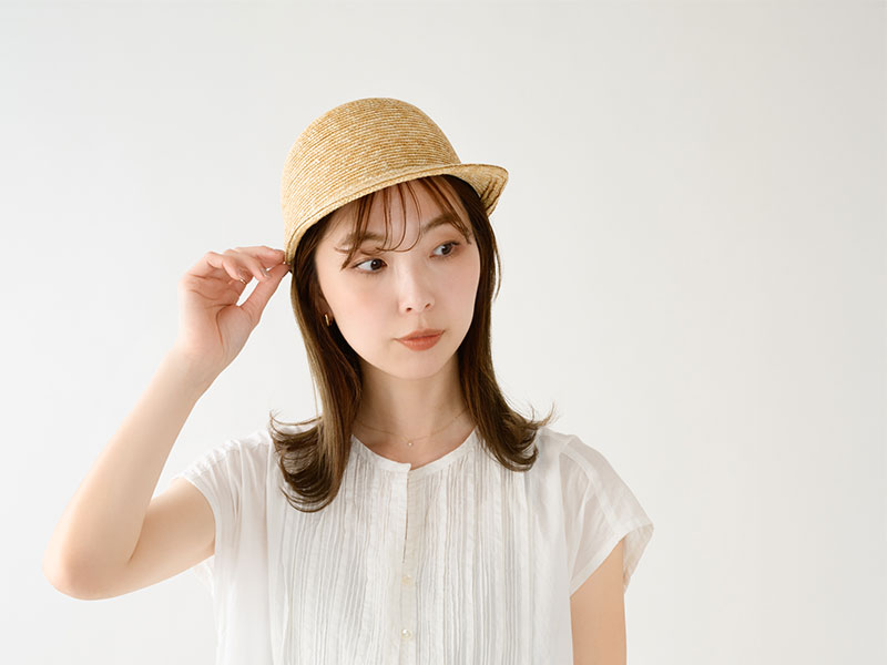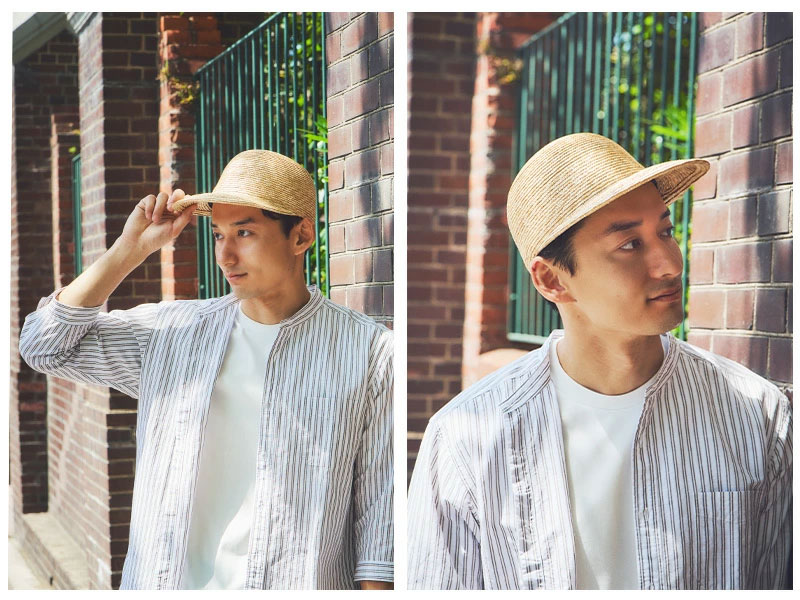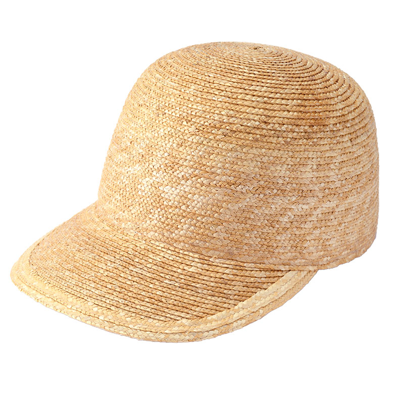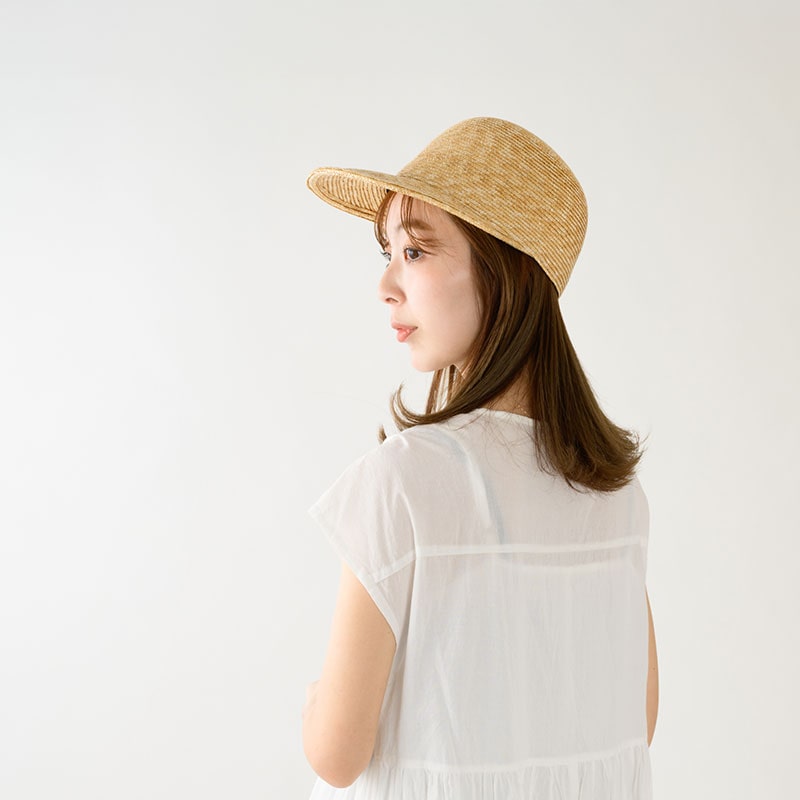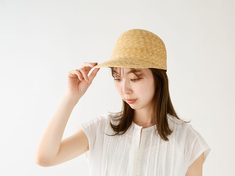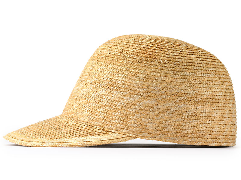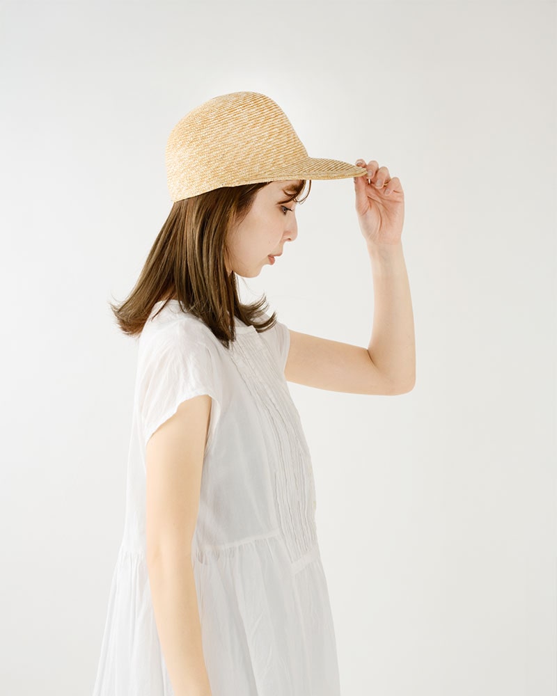 つくり方の複雑な麦わら帽子では作ることが困難だったキャップを商品化しました。つばは少し長めで日除けに最適な長さです。カジュアルなキャップ型ながら、作りは麦わら帽子そのもので、高級感溢れる大人のキャップに仕上がっています。つば先を少し曲げれば、フェイスラインにフィットして、よりお洒落です。
