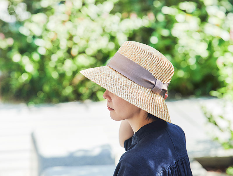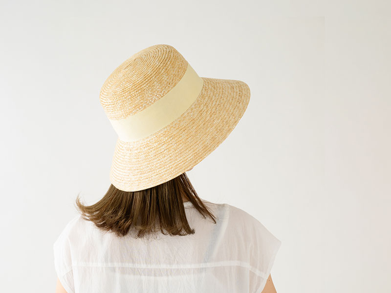 シンプルな太めなリボンはサイドをキュッと絞ってアクセントに。上品なデザインでどなたでもかぶりやすいデザイン。長めのつばは、首筋にもしっかり影を落とします。