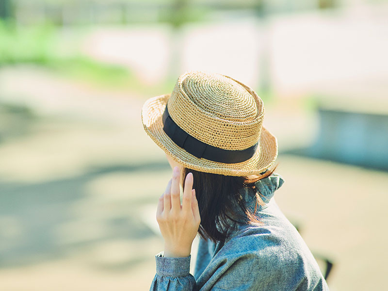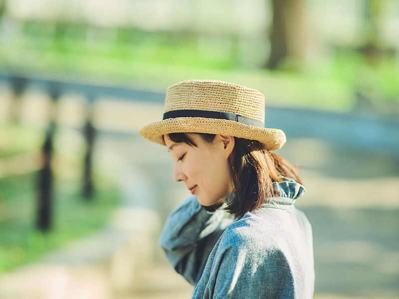 ラフィアとは、マダガスカル原産の「ラフィア椰子」の葉を加工した天然素材です。その繊維から作られる紐を編んだ素材から帽子を作っています。使うほど手に馴染み肌触りもやさしくなっていきます。