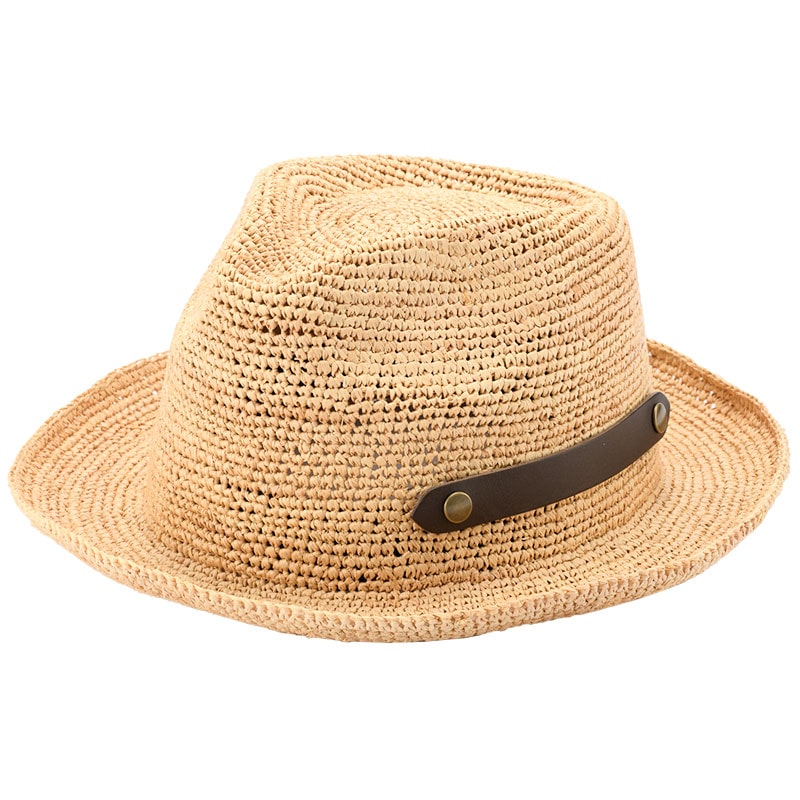 スタンダードな中折れハット。リボンを巻かず、革ベルトがアクセント。帽子は折りたたみが可能で、革ベルトで丸めて留めることができる便利な仕様です。