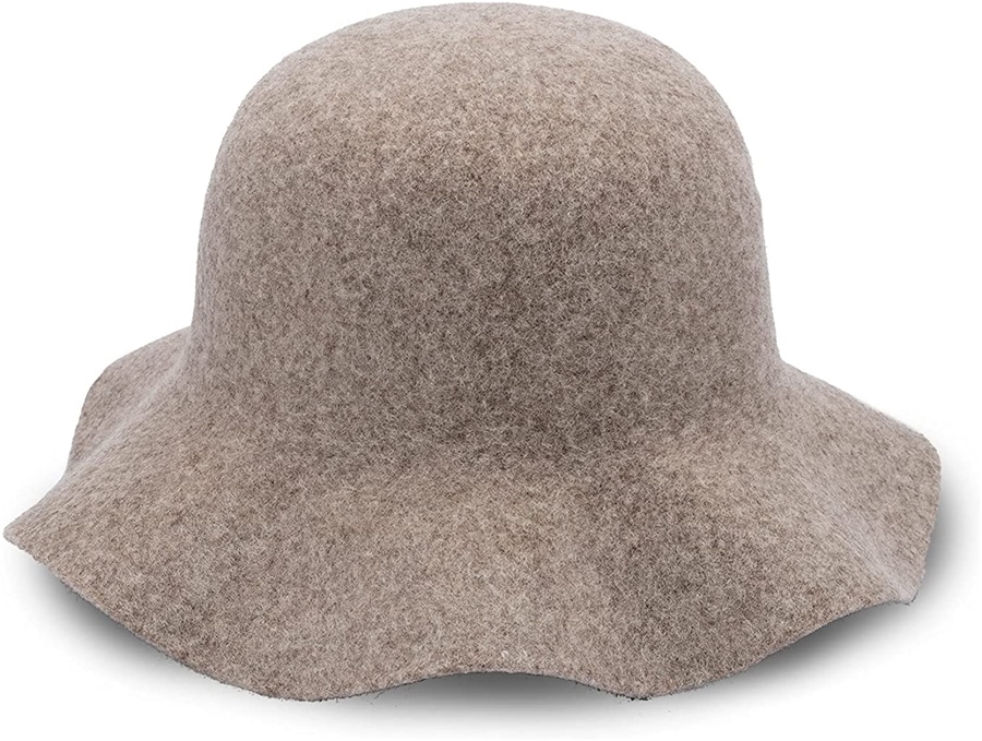 丸い頭型で、ツバが少し下に垂れさがったフレアな仕様。実際に頭に被ると花弁のように美しくフレアが広がります。また、汗止めをつけていない、ウールそのままの帽子なので、かぶった際のフィット感が抜群です。