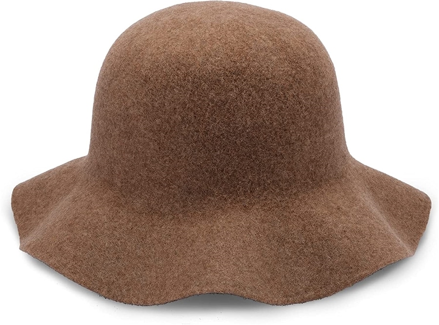 丸い頭型で、ツバが少し下に垂れさがったフレアな仕様。実際に頭に被ると花弁のように美しくフレアが広がります。また、汗止めをつけていない、ウールそのままの帽子なので、かぶった際のフィット感が抜群です。