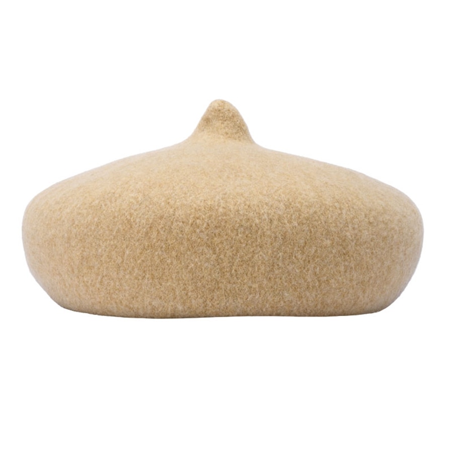 ベレーのトレードマークでものあるチョボ部分をとがらせ、人気の「キスチョコ」のような形に仕上げた帽子です。丸くて深さのあるシルエットに、可愛らしい「とんがり」がアクセントになっています。