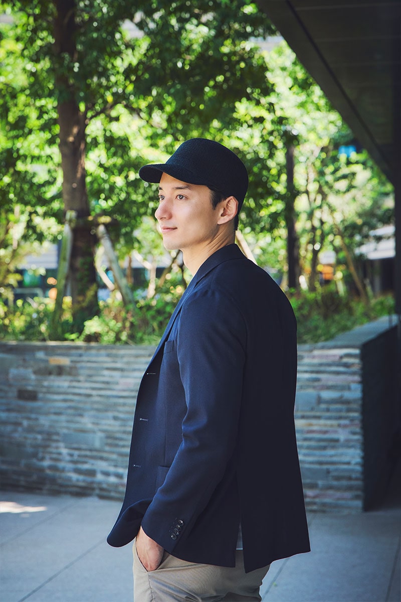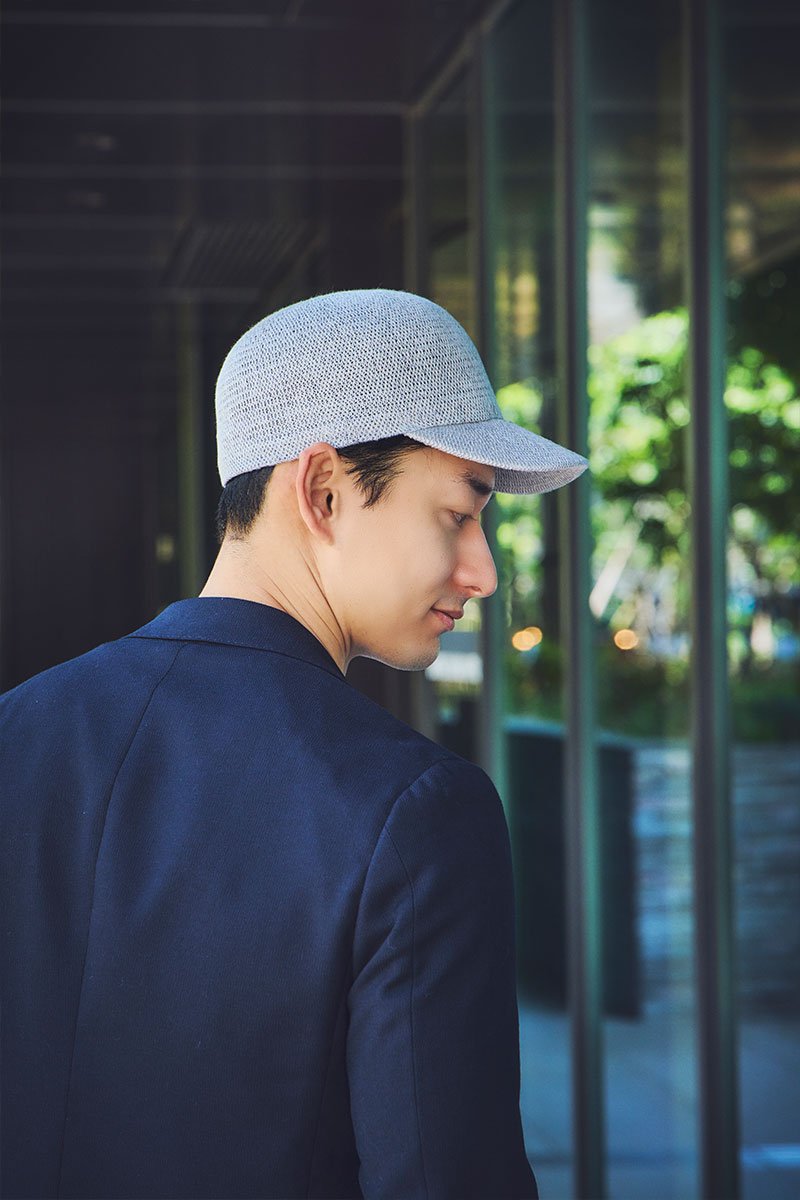 編み機で形を作るニット製品で、ポリエステルを混ぜた混紡素材です。混紡素材の理由は、熱を加えることでポリエステルの繊維が固まり帽子の形になるサーモと呼ばれる帽子だからです。サーモの最大の特長はニット製品でありながら、しっかりとした形状を保つことができることです。今回は、出来るだけニットならではの自然なしなやかさを保つため“柔らか仕立て”で作りました。ニットの帽子は通気性に優れているのも特長のひとつです。