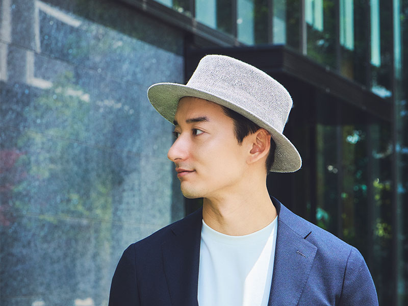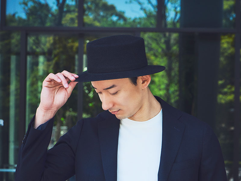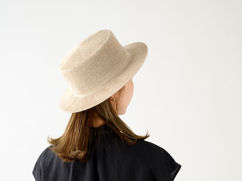 編み機で形を作るニット製品で、サーモ用に天然素材の麻とポリエステルを混ぜた混紡素材を使用しています。ナチュラル素材の「麻」というだけでなく、ニット製品なため通気性に優れているのが特長です。また、サーモとは帽子を型に入れ、熱を加えることでポリエステル樹脂が固まりしっかりとした形状を作る機能です。一度成型した形はつぶれても元の形状に戻る「形状記憶」のようなもので大変便利です。本製品はあえてサーモによる固さを調整し、しなやかさを残しつつ形状を復元できるように作りました。