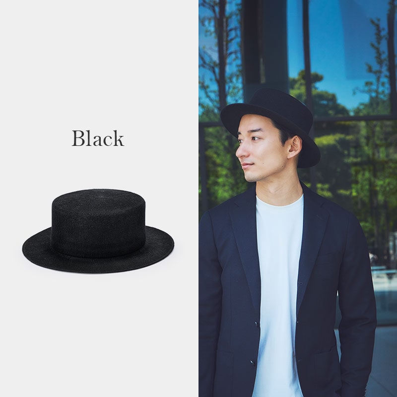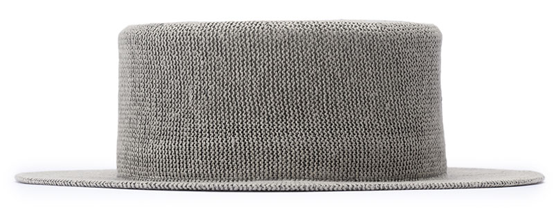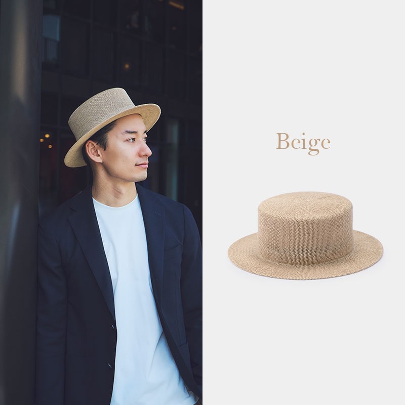 定番のカンカン帽を麻混のニットで仕上げた帽子です。麦わらなどの紐素材で縫い上げることの多いカンカン帽ですが、麻混素材でつくることにより、見た目も涼しげに作ることができました。また、型崩れがしやすい天然素材に比べツバ先にワイヤーを入れることにより、形状もキープしやすくなっています。つばは6cm。この長さが絶妙なバランスになっています。サイズ調整テープも付いており、ご自身の頭のサイズに合わせて調整していただけるホスピタリティの高い商品です。