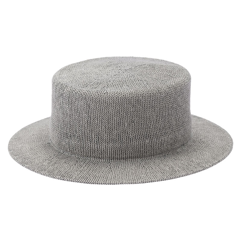 定番のカンカン帽を麻混のニットで仕上げた帽子です。麦わらなどの紐素材で縫い上げることの多いカンカン帽ですが、麻混素材でつくることにより、見た目も涼しげに作ることができました。また、型崩れがしやすい天然素材に比べツバ先にワイヤーを入れることにより、形状もキープしやすくなっています。つばは6cm。この長さが絶妙なバランスになっています。サイズ調整テープも付いており、ご自身の頭のサイズに合わせて調整していただけるホスピタリティの高い商品です。