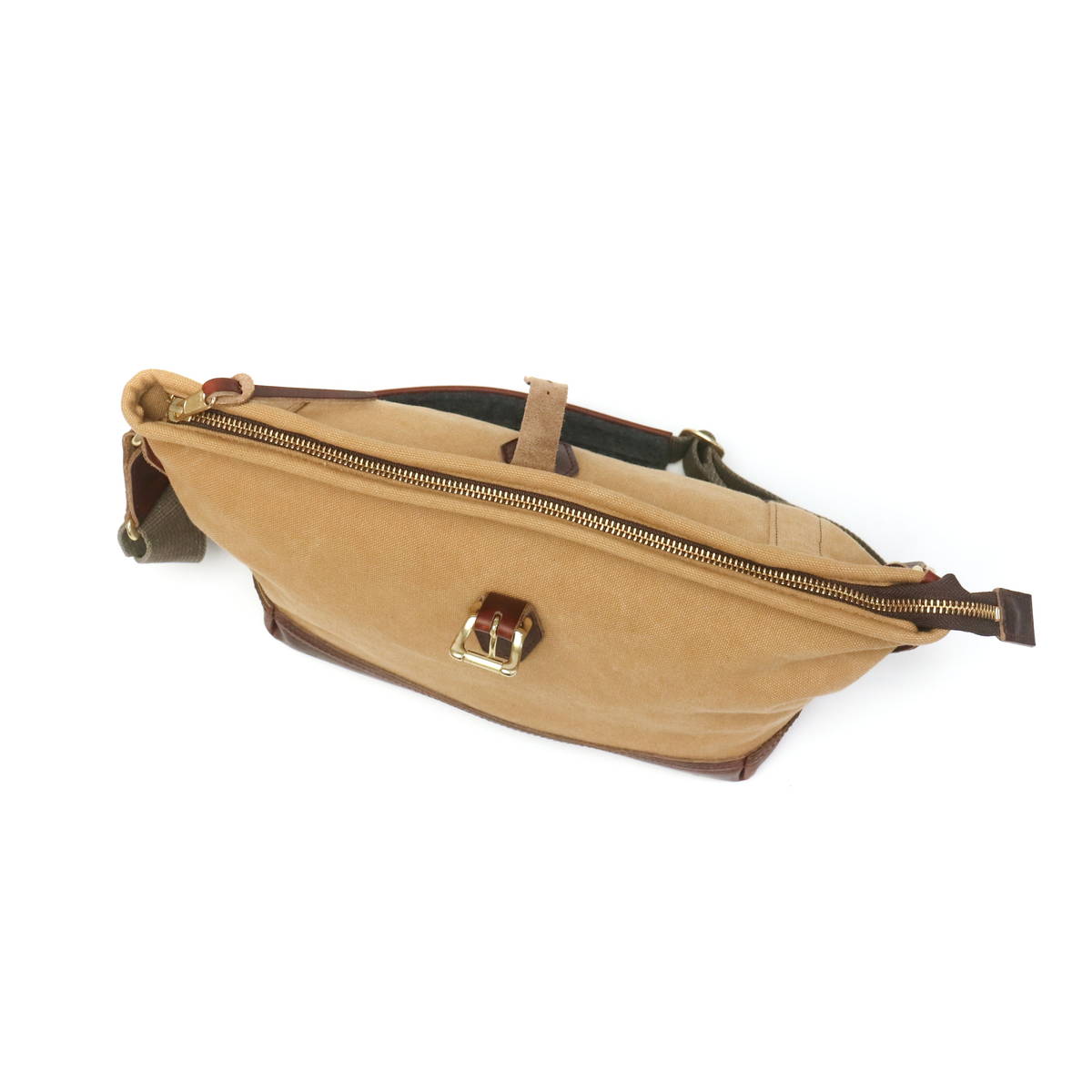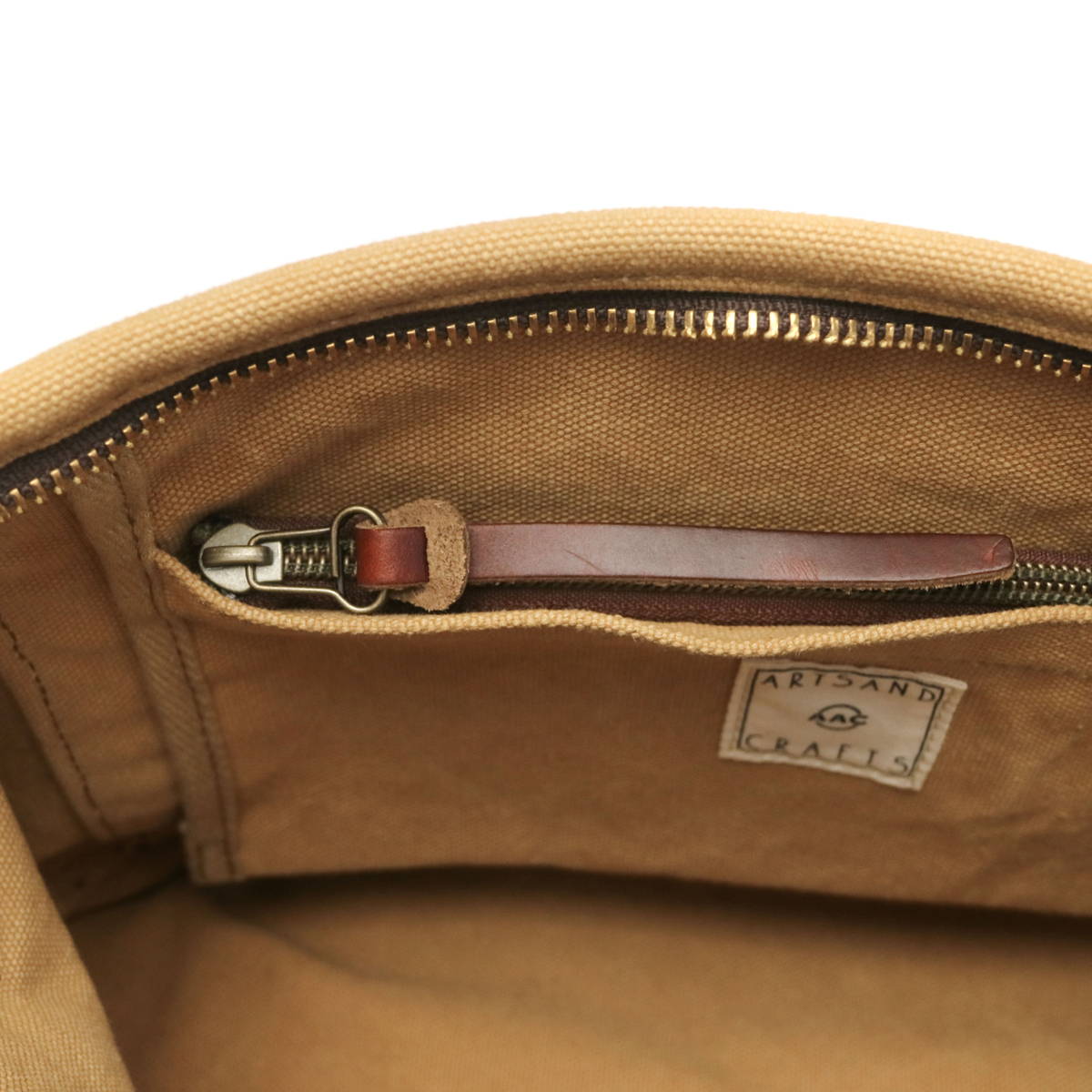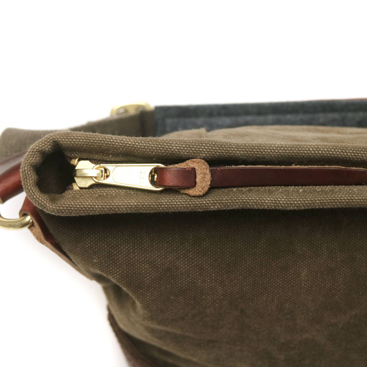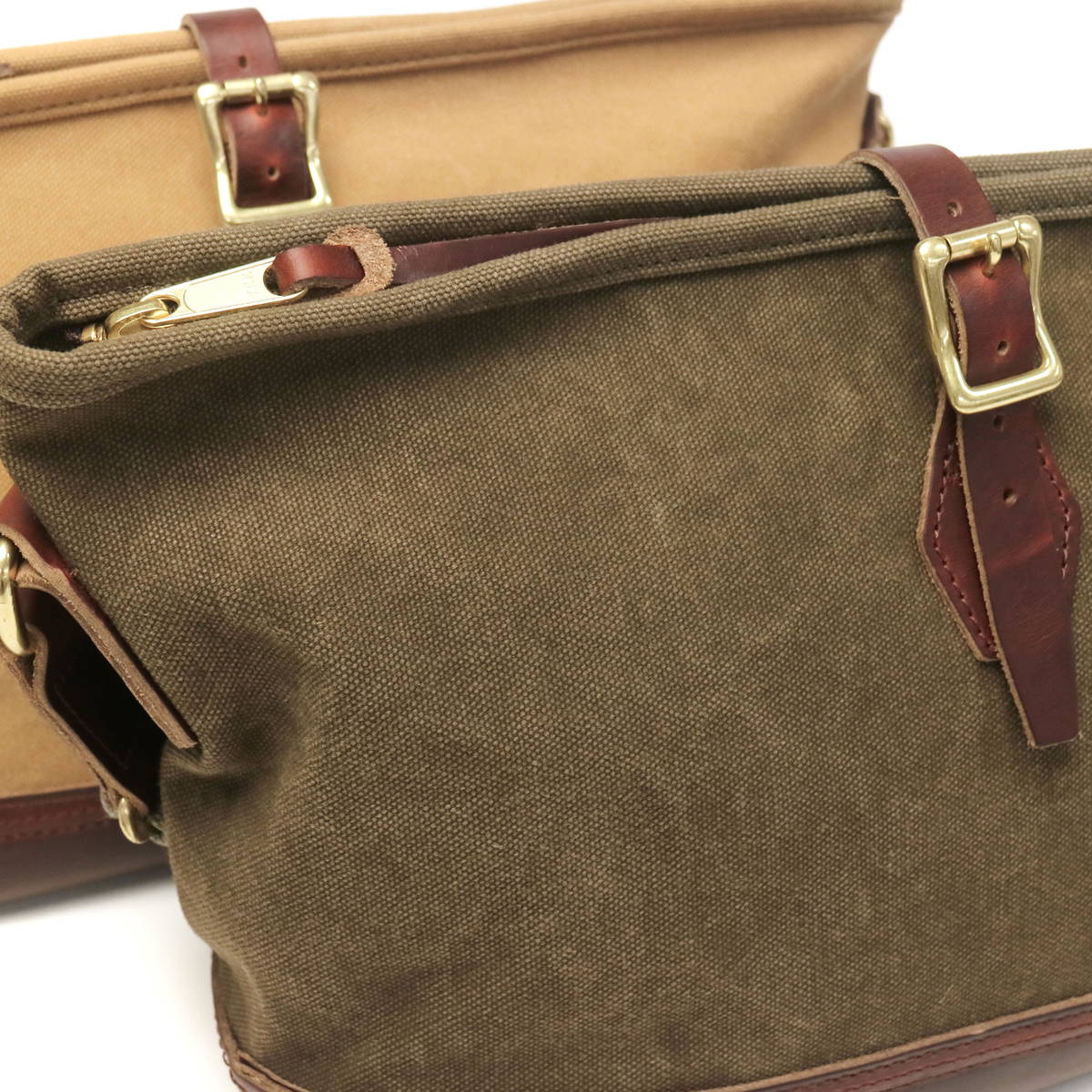 メイン素材には、ベジタブルタンニンで染められた6号帆布を使用。使い込むことで風合いが増していく味わい深い素材です。また、付属部分のレザーには、コードヴァンで有名なホーウィン社のクロムエクセルレザーを使用しています。オイルを豊富に含んでいるため水に強く、柔らかく馴染みやすいレザーです。