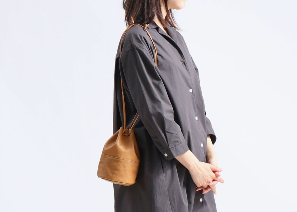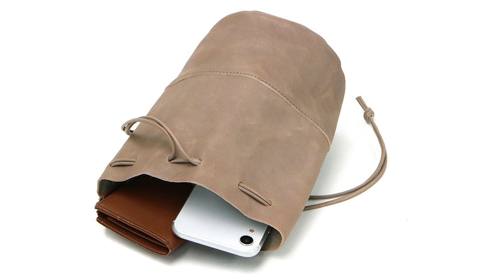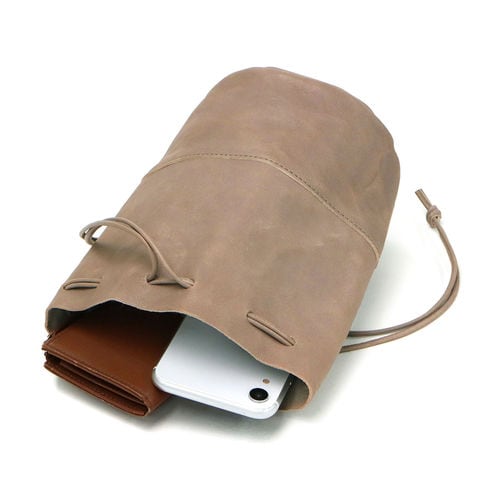 日本古来の巾着袋をヒントに、現代の装いに合うようレザーでデザインした味わい深く愛着の湧く巾着バッグ。こちらは巾着シリーズの中で一番小さなSサイズです。男女問わず合わせやすいシンプルで飽きのこないデザインと、ポケット感覚で身軽に持ち歩ける気軽さが魅力です。