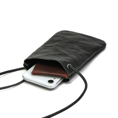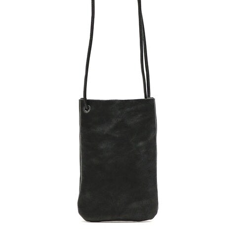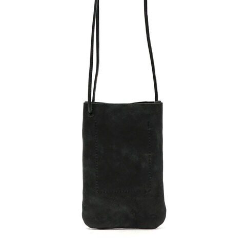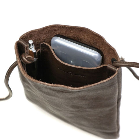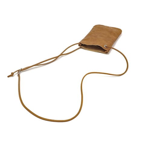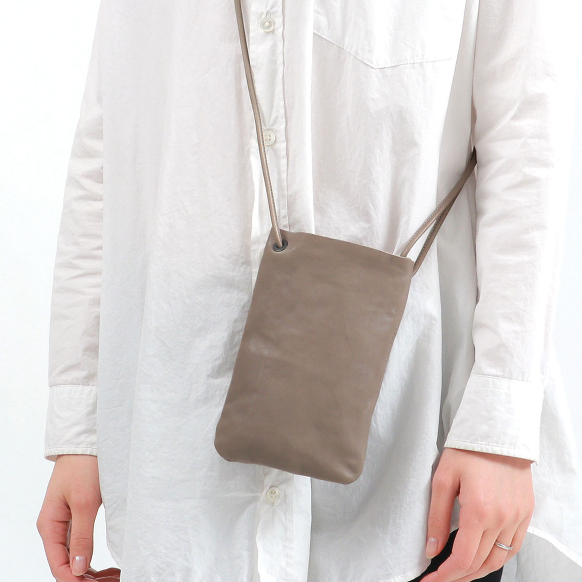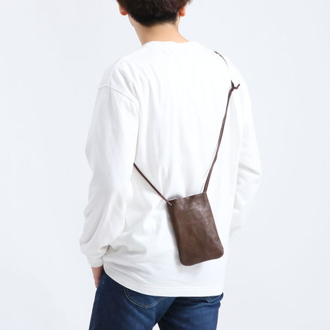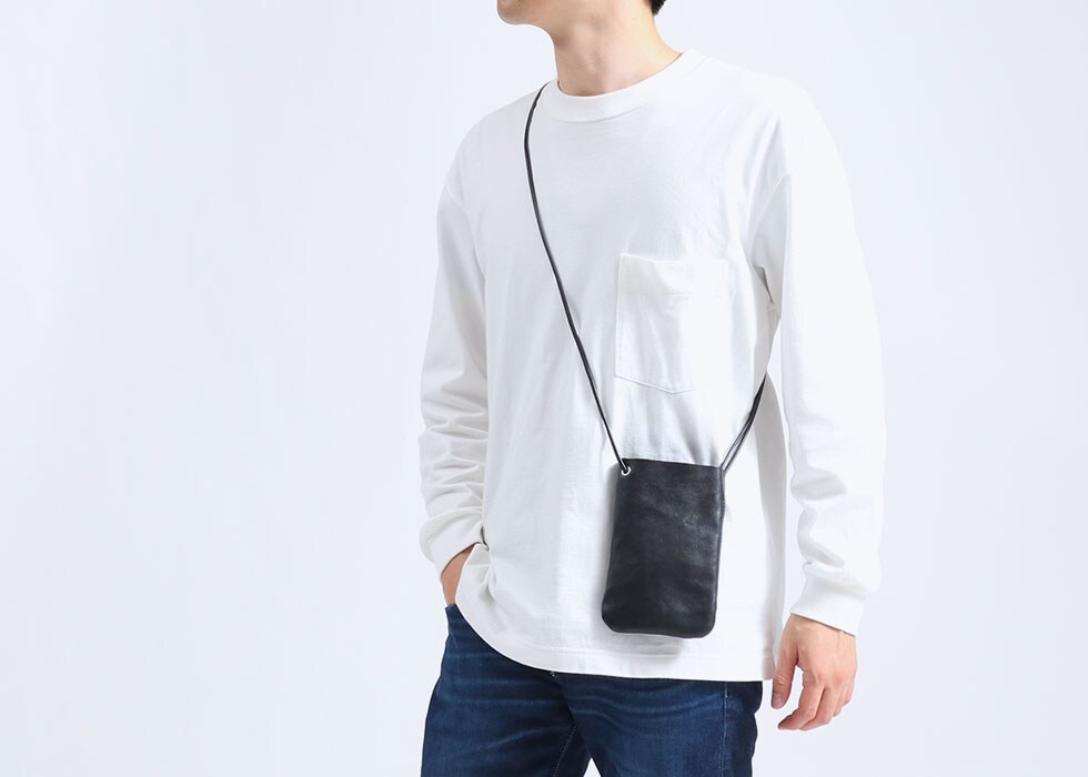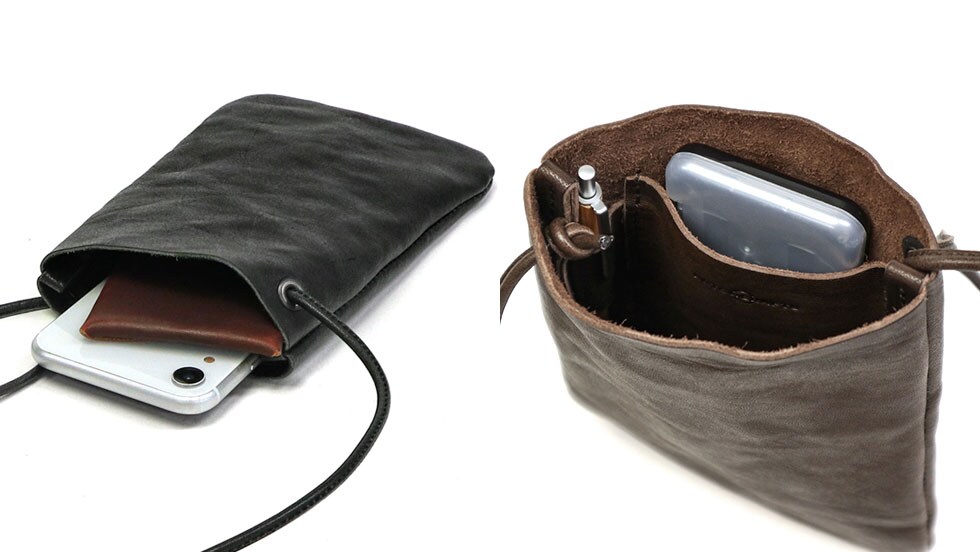 本体の前後にハトメを打ち、革紐を通したシンプルなデザインのショルダーバッグ。こちらはスマホやちょっとした小物類の収納に役立つミニマルなSサイズ。普段荷物の少ない方にはもちろん、サブバッグとして貴重品だけを持ち歩きたいときなどに重宝するアイテムです。