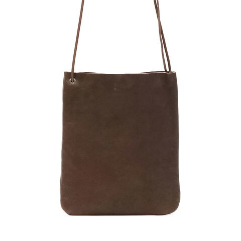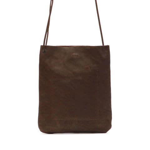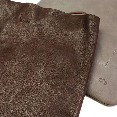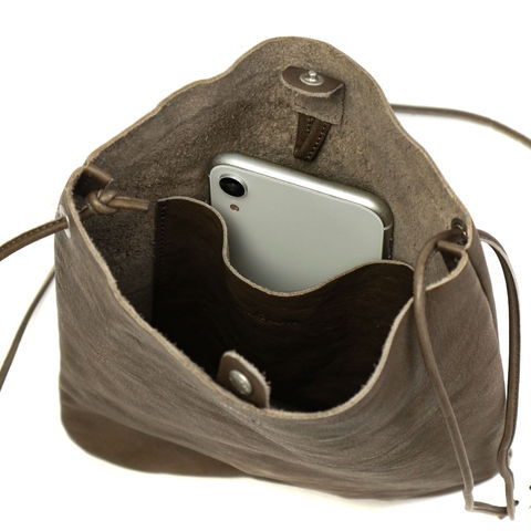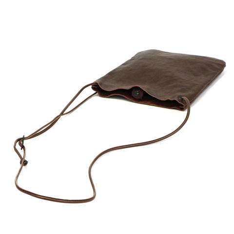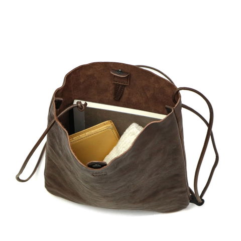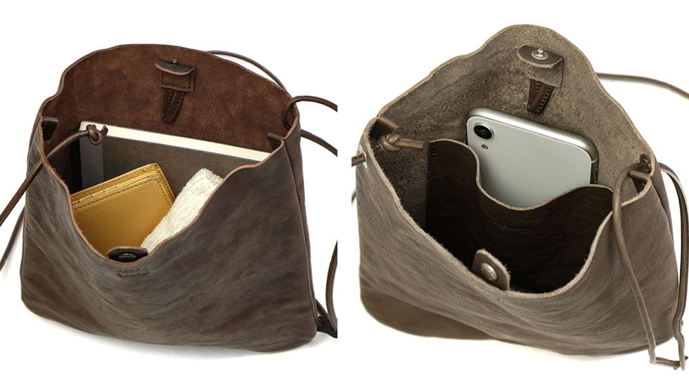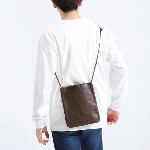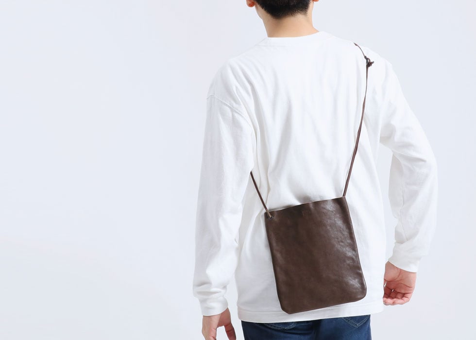本体の前後にハトメを打ち、革紐を通したシンプルなデザインのショルダーバッグ。こちらは財布やスマホなど身の回りの小物を入れるのに便利なLサイズです。普段から荷物量の少ない方や、コーディネートに添える程度のカバンをお求めの方にオススメのスリムな仕上がりです。