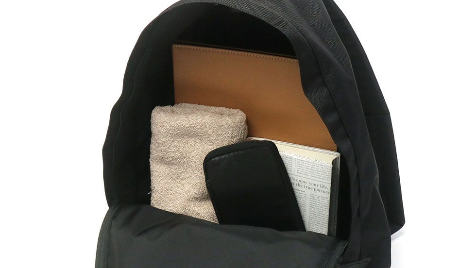 収納スペースは、A4サイズがしっかり収まるサイズ感。収納口は大きく開き視認性に優れた構造になっているので、荷物をスムーズに出し入れすることができます。また、フロント部分に設けた立体感のあるポケットは、サッと出し入れしたい小物の収納に重宝します。