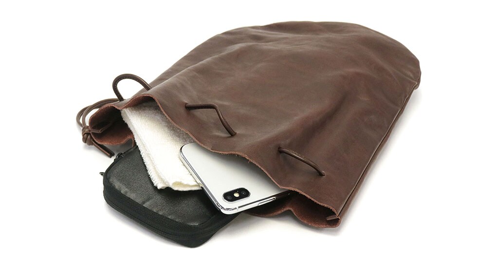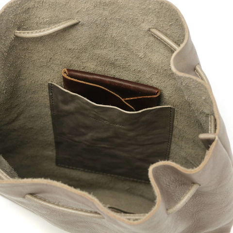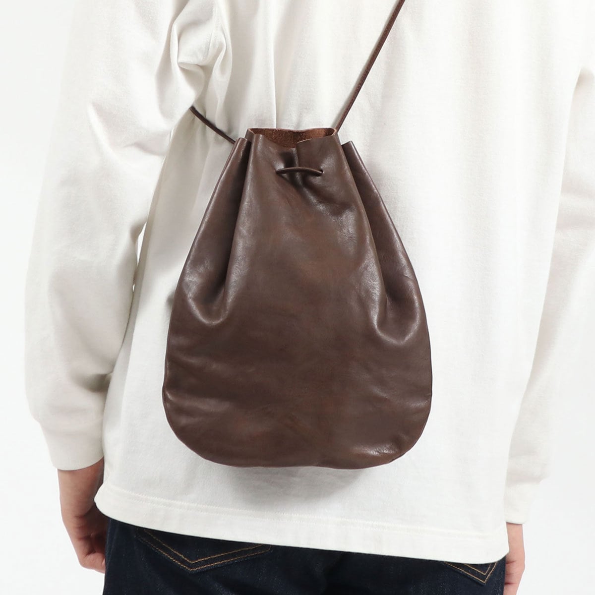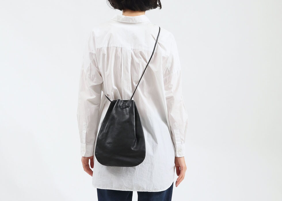 滴型(ドロップシェイプ)が特徴の巾着ショルダーバッグのMサイズ。ちょっとしたお出掛けのお供に最適なサイズ感と、シンプルながらコーデに映えるフォルムが魅力的です。前掛けや斜め掛け、手持ちなど、シーンやお好みに合わせたスタイルでお持ちいただけます。