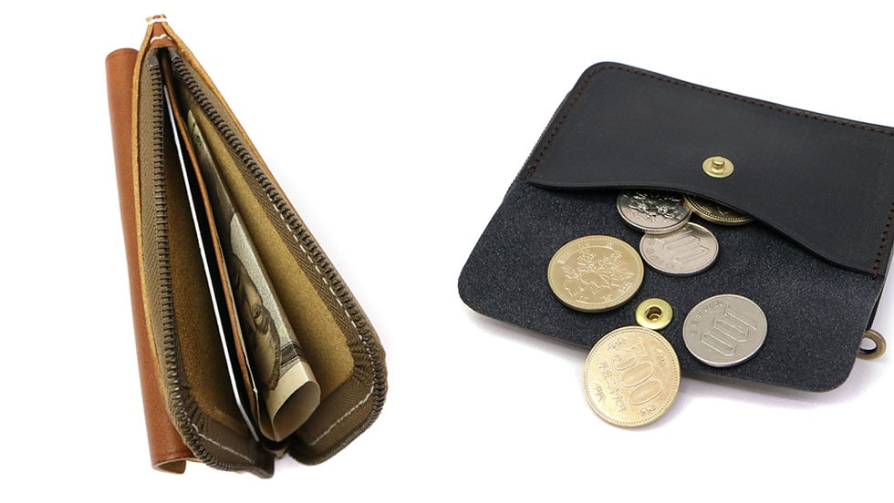 本体外側にはフラップが目を引く小銭入れを配置。L字ファスナー式の収納部は、真ん中に仕切りがありお札を金額別に分けて収納したり、お札とカードを分けて収納したりと自分好みにお使いいただけます。