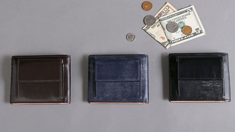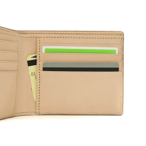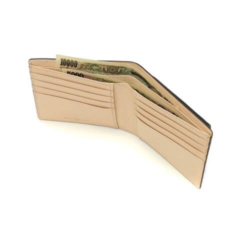内装は、8カ所のカードポケットと2カ所のフリーポケットを装備。仕切り付き札入れで、お札と領収書など仕分け収納が可能です。外側に配置した小銭入れは、出し入れをスムーズに行うことができます。内装革にはヨーロッパメイドのヌメ革を採用。