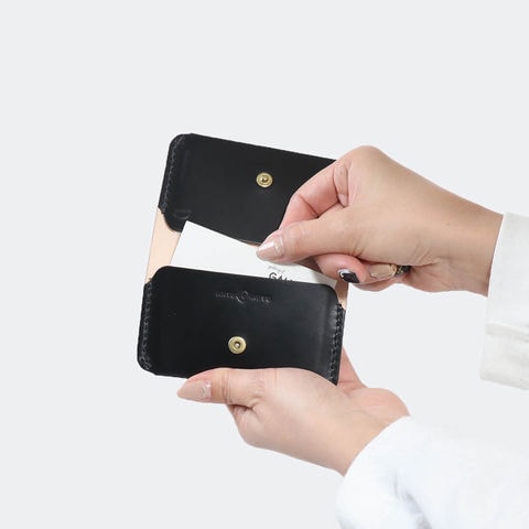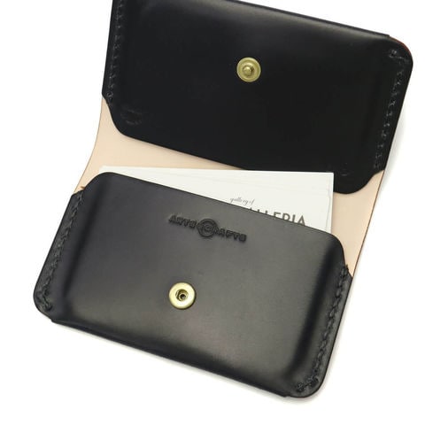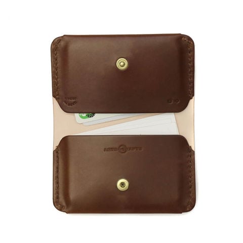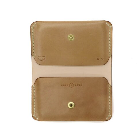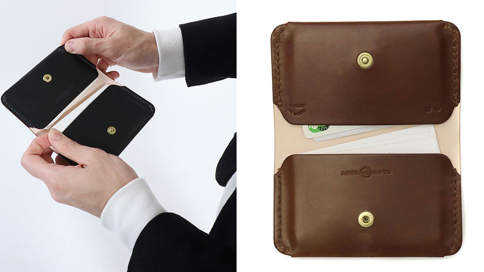 本体は、2カ所の収納が設けられており、名刺入れとしてのご使用はもちろん、カードケースとしてもオススメです。ポケット部分は木型を入れて少し膨らみを持たせ、内装には表面の肌当たりが非常に良いヌメ革を張り合わせています。職人の繊細な手仕事を感じる逸品です。