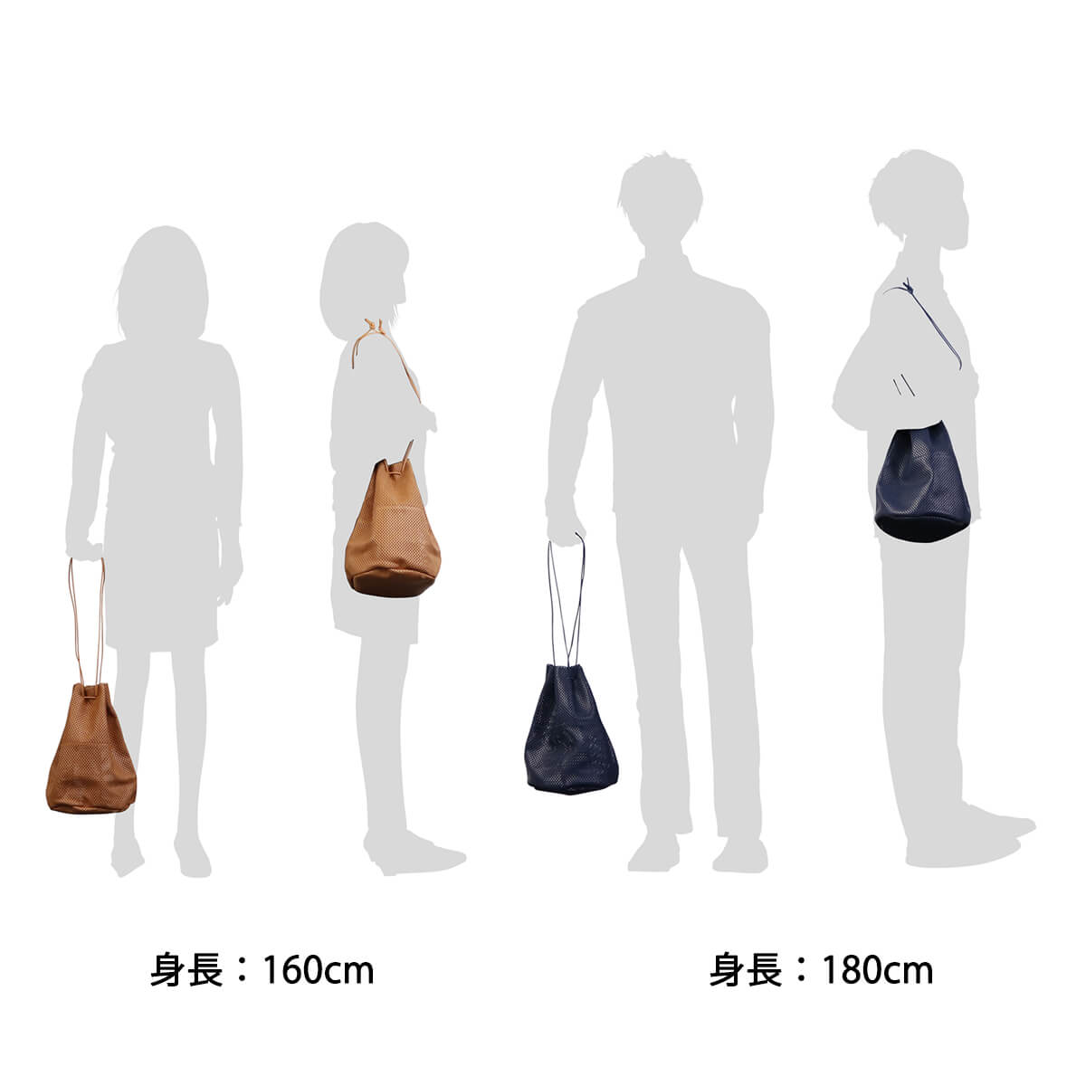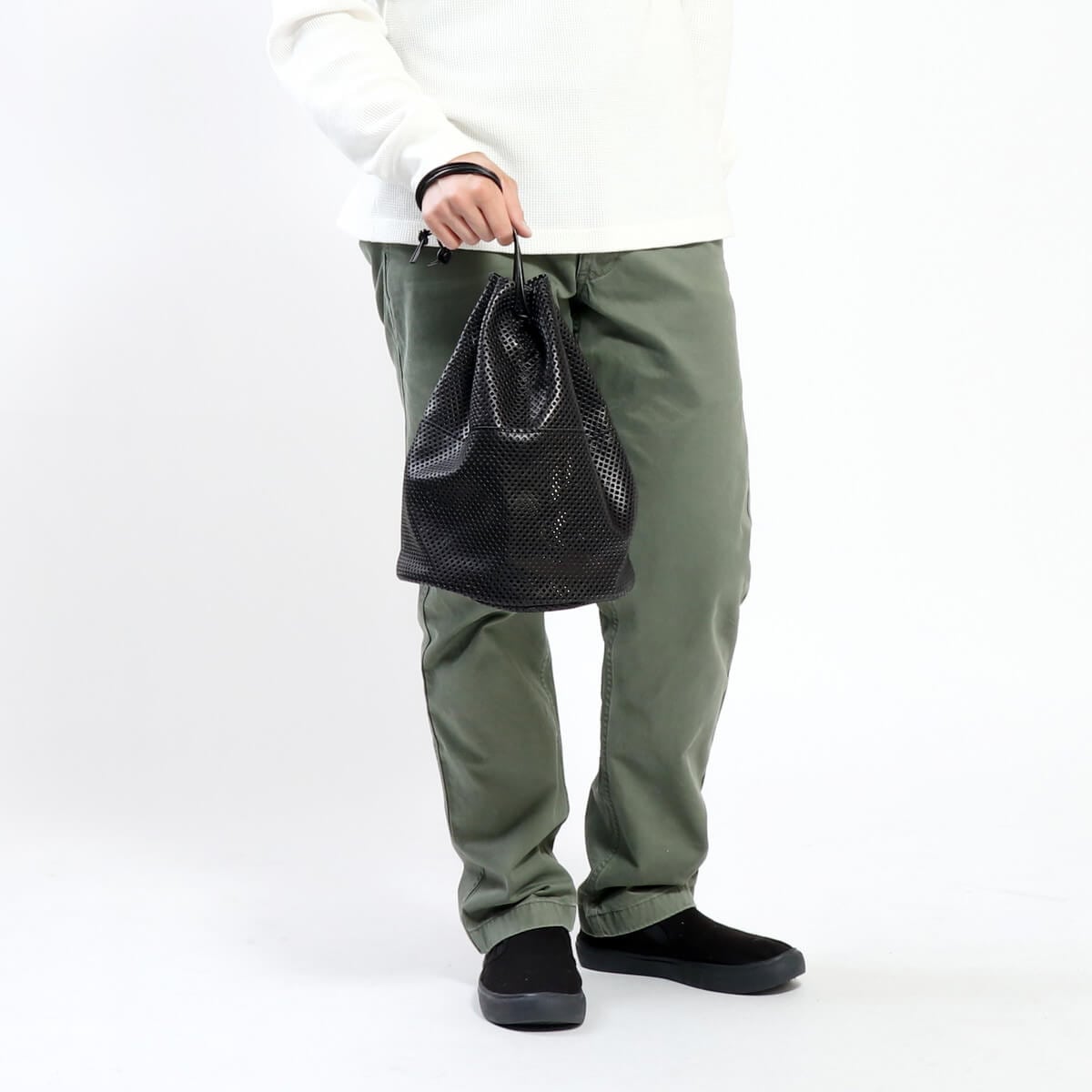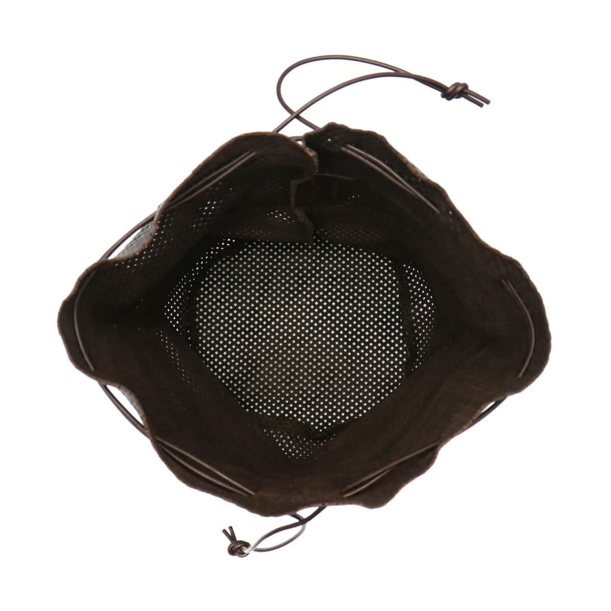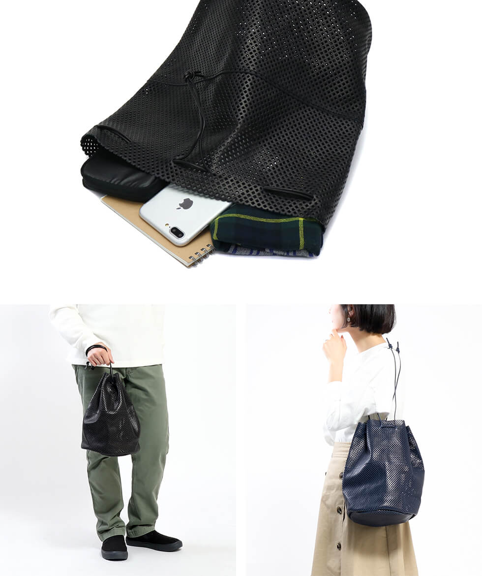 日本古来の小物や手回り品を収納して持ち歩くための紐で縛って携帯する巾着袋をヒントに、今の装いに合うようにシンプルにデザインした『HORSE LEATHER/ホースレザー』シリーズから、透け感が魅力の巾着バッグが登場です。こちらは巾着シリーズの中で一番容量が入るXLサイズとなっています。