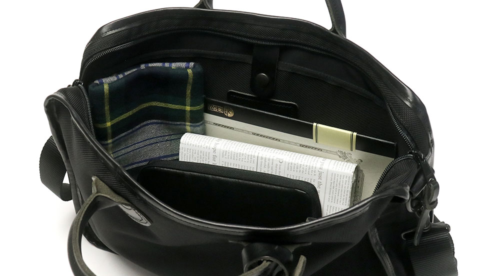収納スペースはA4サイズがゆったり収まるサイズ感となっており、書類やファイルの収納に最適です。また、内外に複数の小分けポケットを設けているので、バッグの中で細かな荷物が散らばる心配もありません。