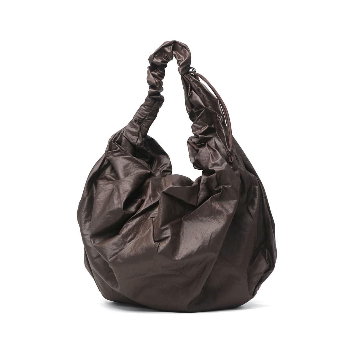 さりげない光沢が魅力の素材を使用した、軽量で薄手のリップストップ生地のトートバッグ。ドレーピングシルエットとツイストストラップが軽やかな抜け感を演出します。ハンドルはストリングとストッパーで長さを調節でき、スタイルに合わせた持ち方を楽しめます。A4サイズが収まる収納力で、日常使いにも最適。内側には耐久性に優れたナイロン裏地を採用し、ファスナーポケット付きで安定感のある使い心地を実現しました。