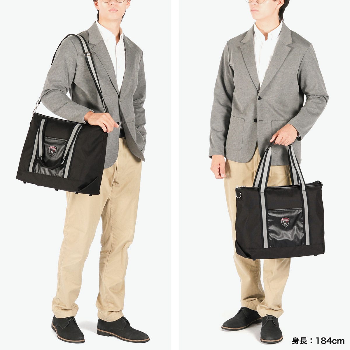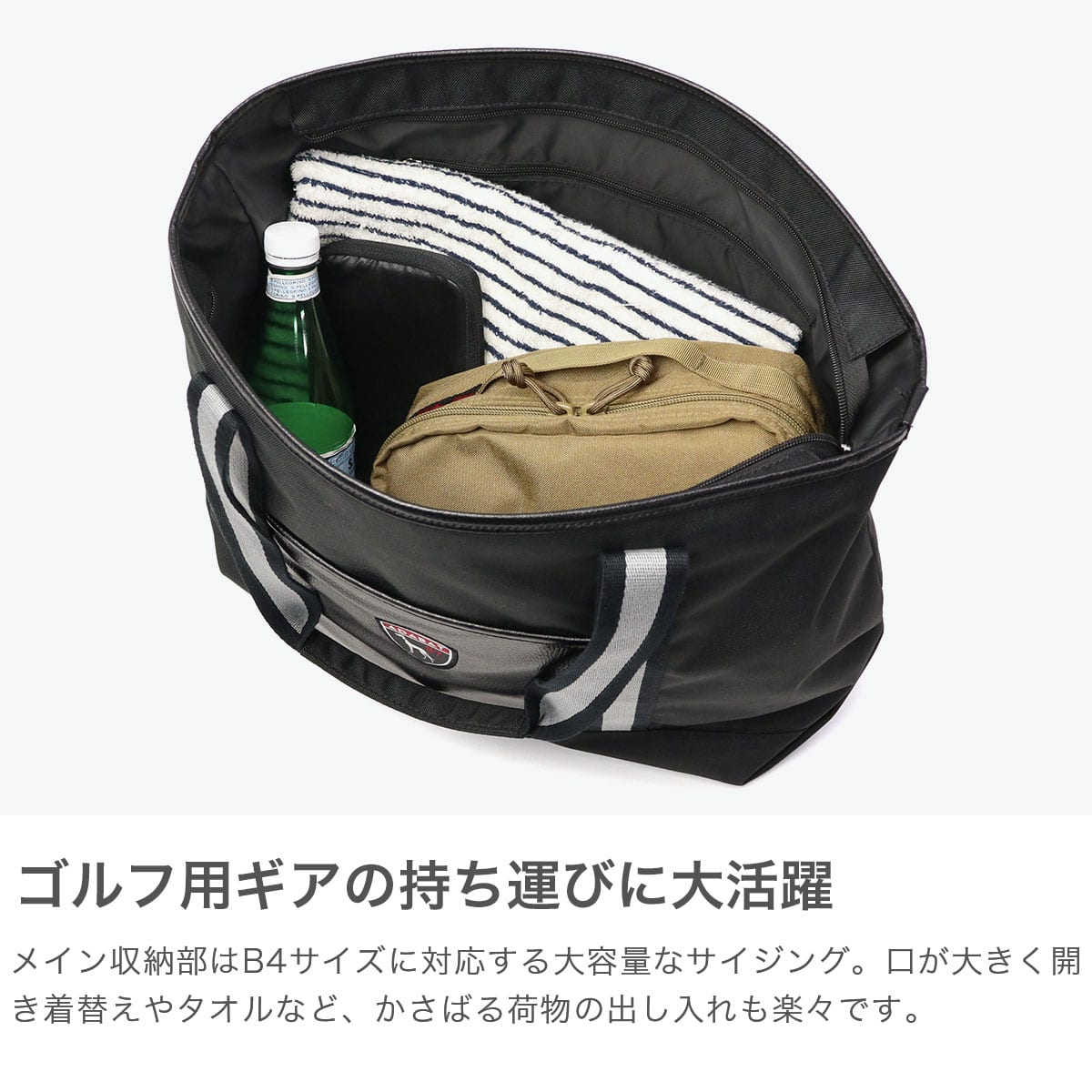 ユニセックスで使いやすいカジュアルなデザインに合成皮革を部分使いした、ほどよい上品さが魅力のゴルフ用トートバッグです。ショルダーストラップ付きで、肩掛け・手持ちの2WAY仕様。ラウンドの合間はもちろん、練習や普段使いにも活躍します。