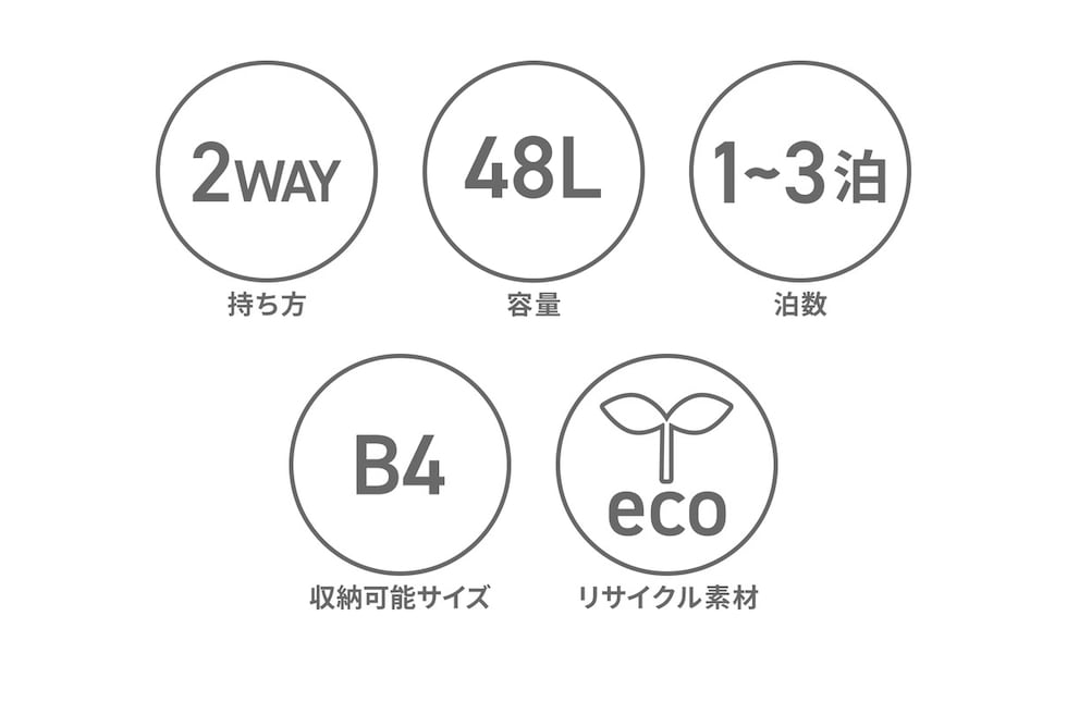 シンプルかつスポーティーなルックスで、老若男女問わずに使える2WAYボストンバッグ。ショルダーストラップとハンドルの使い分けができる、汎用性の高いデザインです。収納部は48Lの容量を備え、1~3泊程度の旅行や合宿に最適なサイズ感。内装に吊りポケットを1つ設けているので、小物類の管理に役立ちます。また、外側にもポケットを配置し、サッと取り出したいアイテムの収納に便利なつくりになっています。