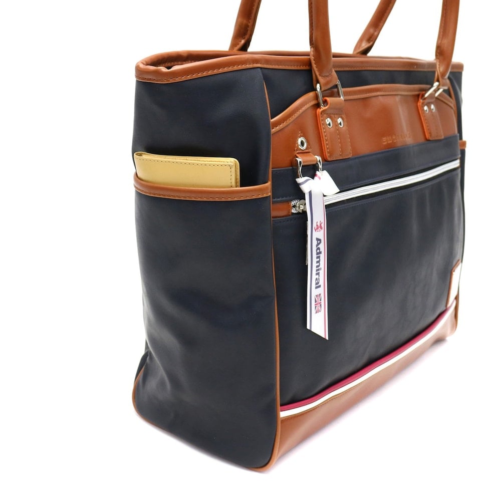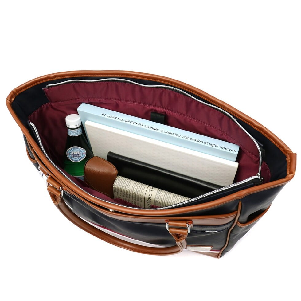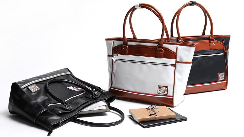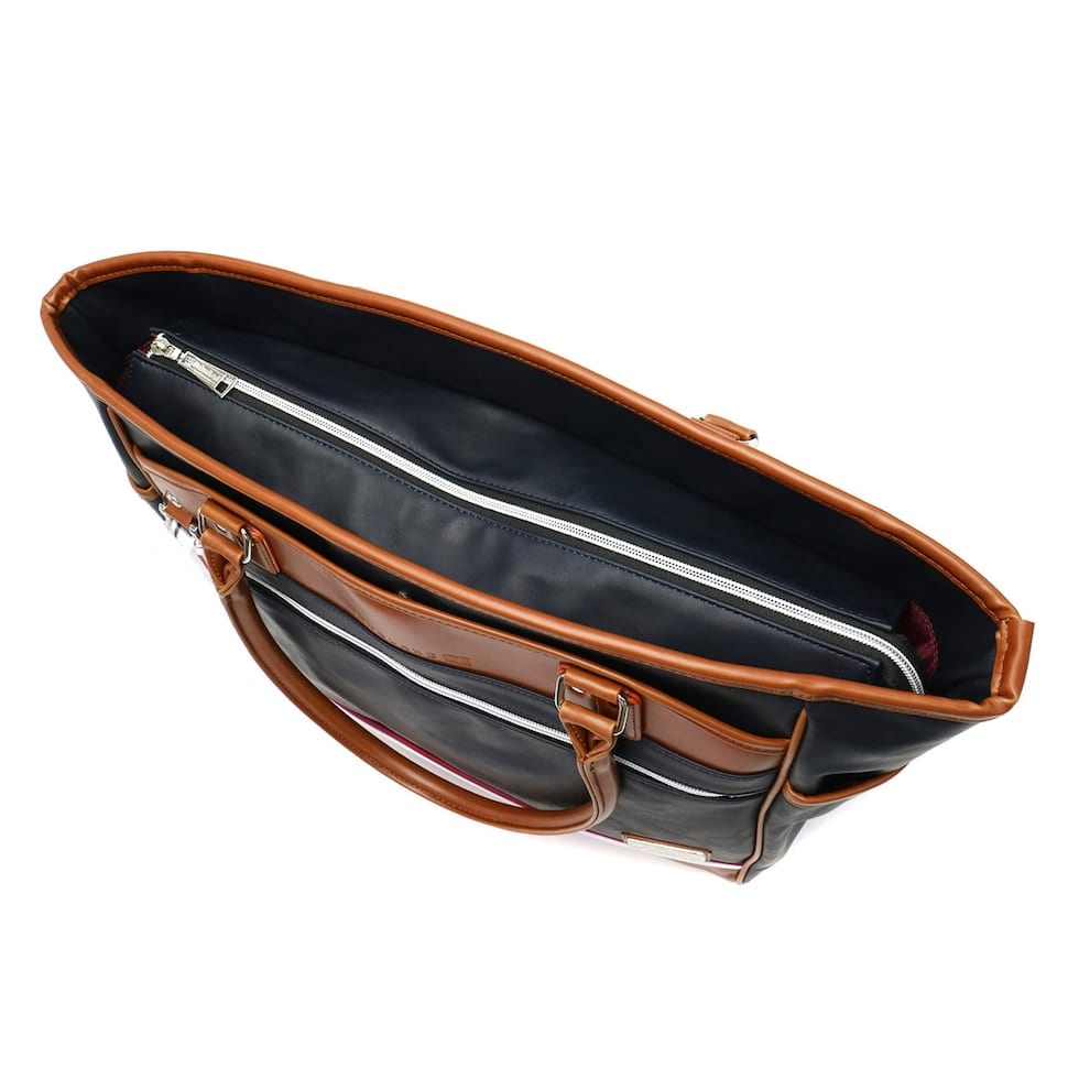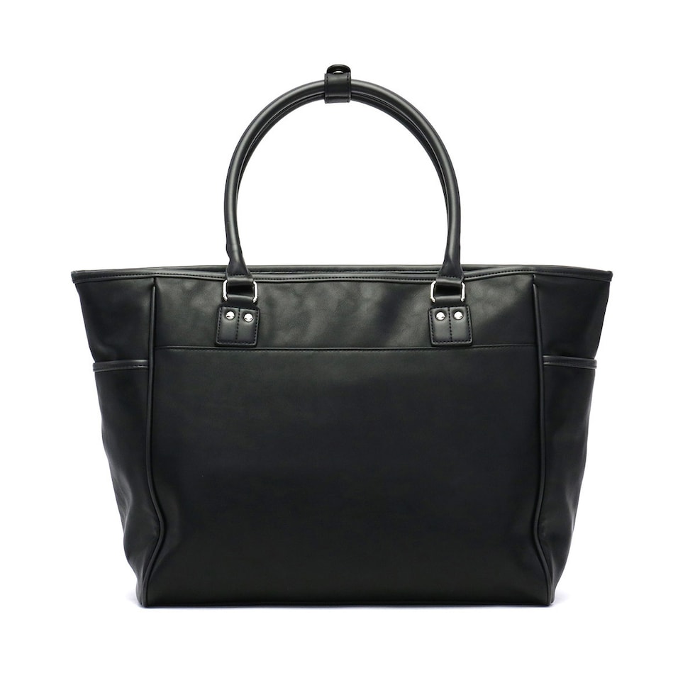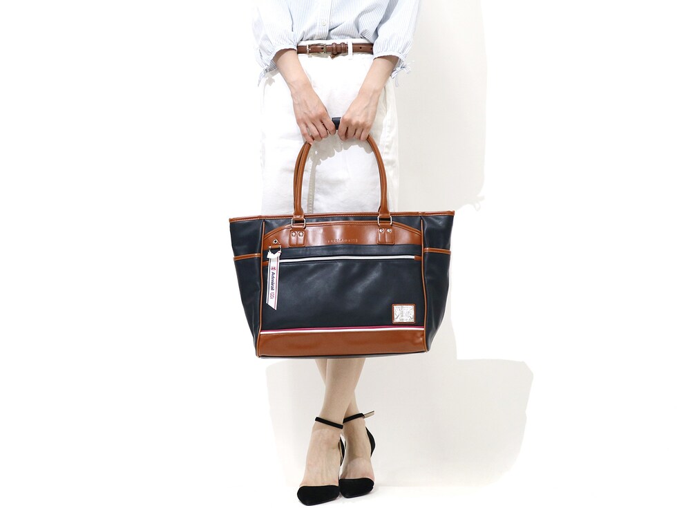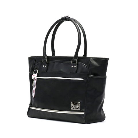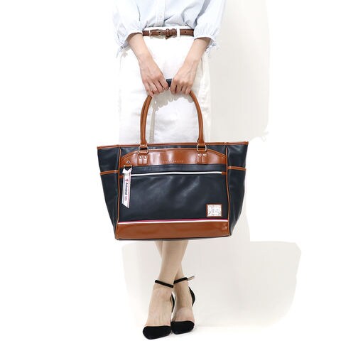ジャケットスタイルにぴったりなハリのある合成皮革を使用したトートバッグです。艶やかで上品な質感と、高級感のあるフロントのメタルプレートがマッチし、英国を感じられる仕上がりになっています。ジップ開閉式で通勤や通学にもぴったりなデザインです。