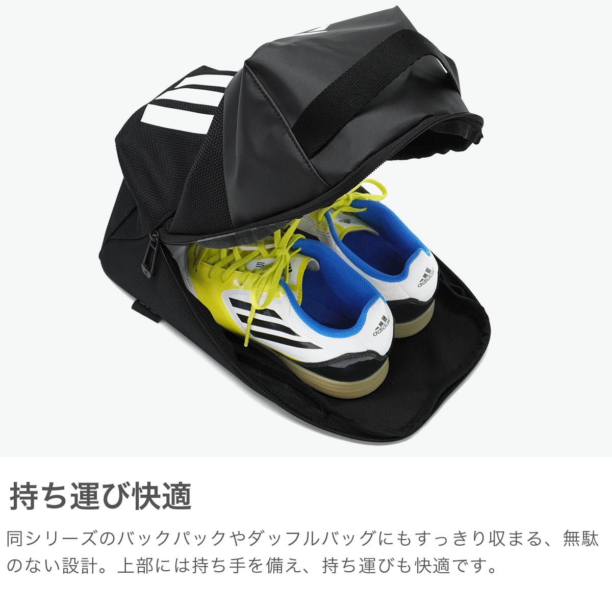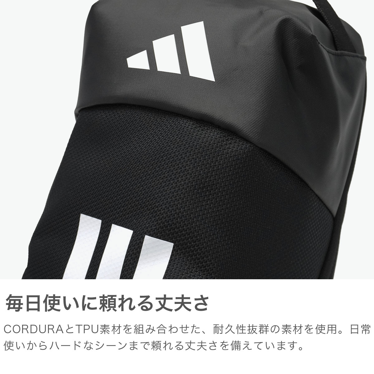 アスリート・部活生のためのシリーズ「EP/Syst.(イーピーエス)」のシューズバッグ。CORDURAとTPU素材を組み合わせ、優れた耐久性を実現しています。ダッフルバッグやバックパックの中にもすっきり収まる無駄のない設計。スマートに持ち運びでき、部活や遠征など移動の多いシーンにも頼れるアイテムです。