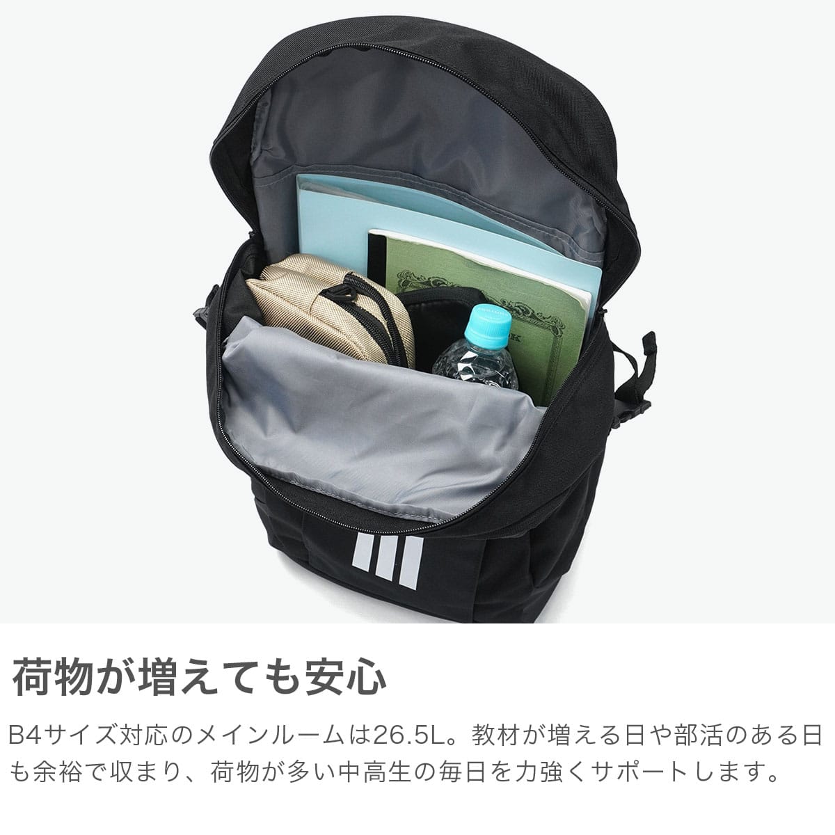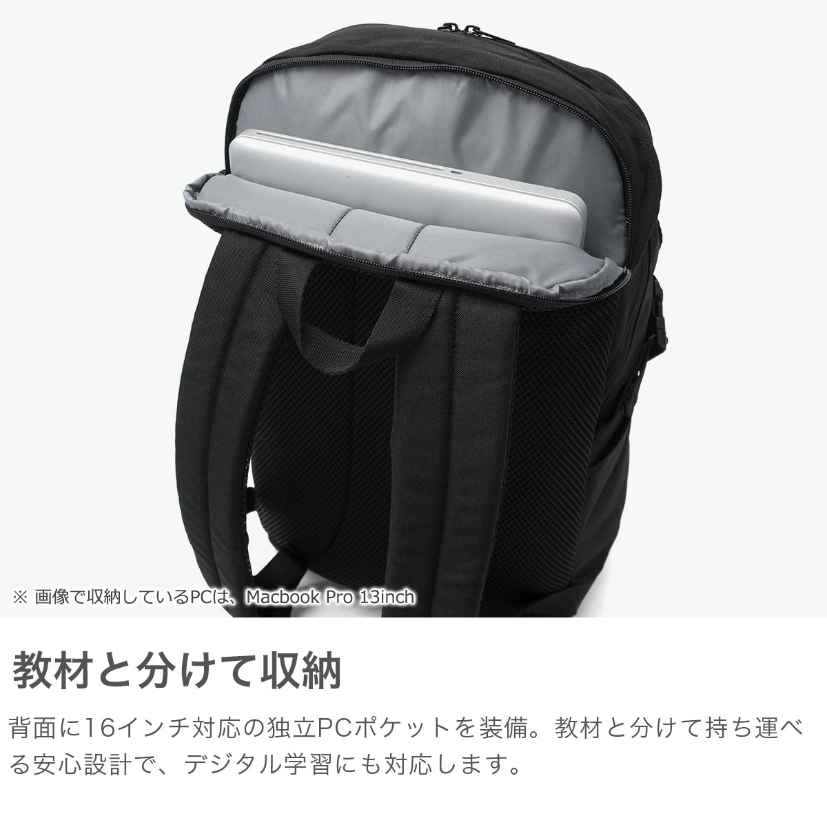 通学にも普段使いにも活躍する、26.5L容量のバックパック。学校や塾、部活、週末のお出かけまで幅広いシーンに対応します。B4サイズ対応のメイン収納に加え、外側には複数のポケットとPC収納を装備。荷物の量に合わせてサイドのコンプレッションコードを調整すれば、見た目もすっきり。通気性のある背面メッシュ仕様で、毎日快適に使えるアイテムです。