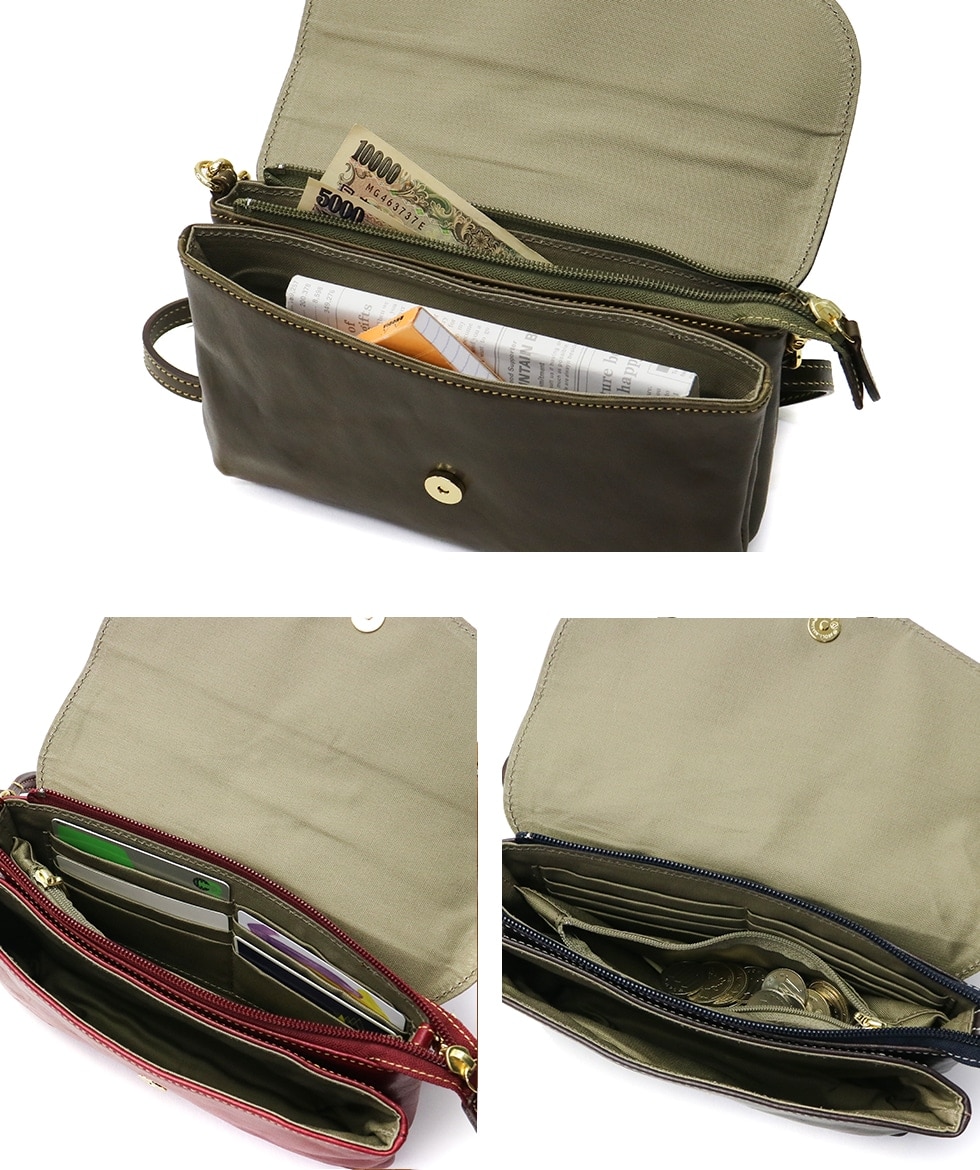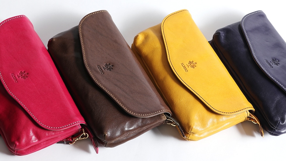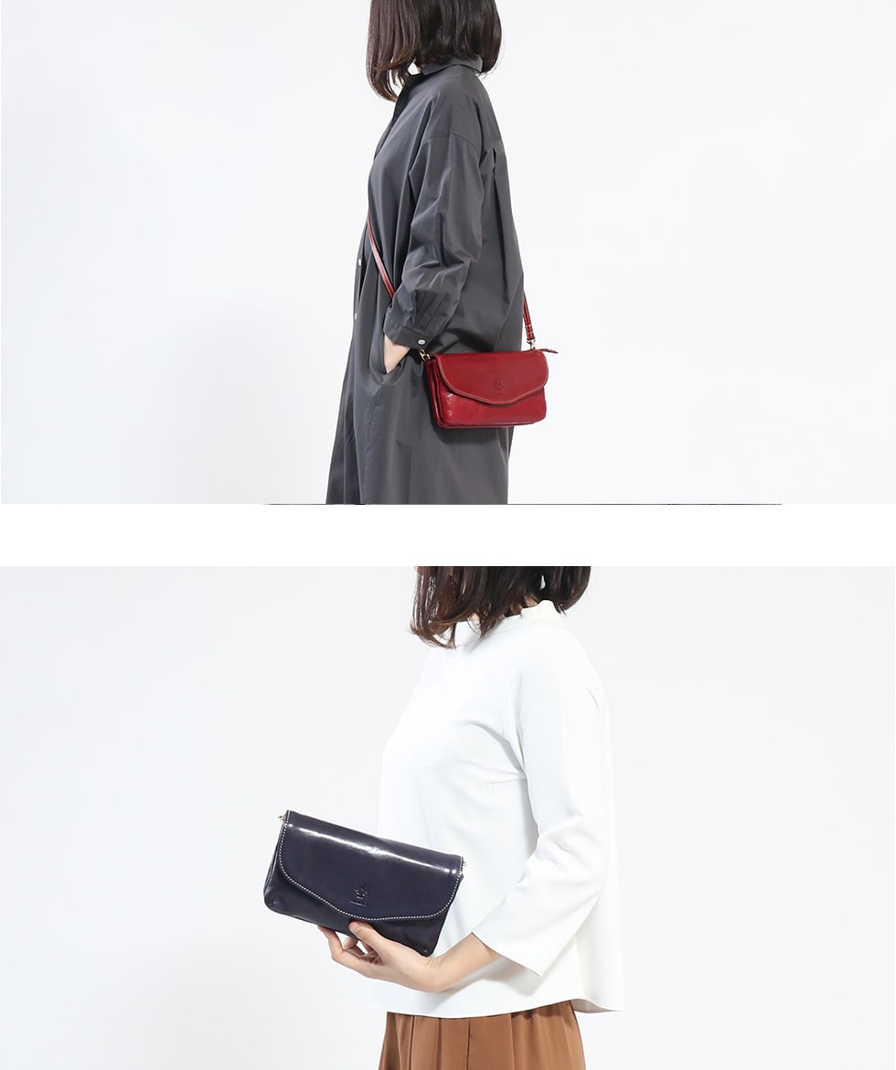 艶やかな発色と、レトロなゴールドの金具がきれいめカジュアルに合わせやすい『PIERROT/ピエロ』シリーズの2WAYショルダーバッグ。独自の光沢とナチュラルなしわ感が魅力的なレザーを使用しています。お財布機能を搭載し、あらゆるシーンで使える便利なバッグです。