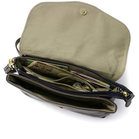 収納スペースは荷物を整理しやすい2層タイプ。背面側の収納スペースはお財布として使える仕様になっており、紙幣やカード、小銭まで収納できる便利な設計。これ一つで身軽にお出掛けできて、支払いもスムーズに行えます。