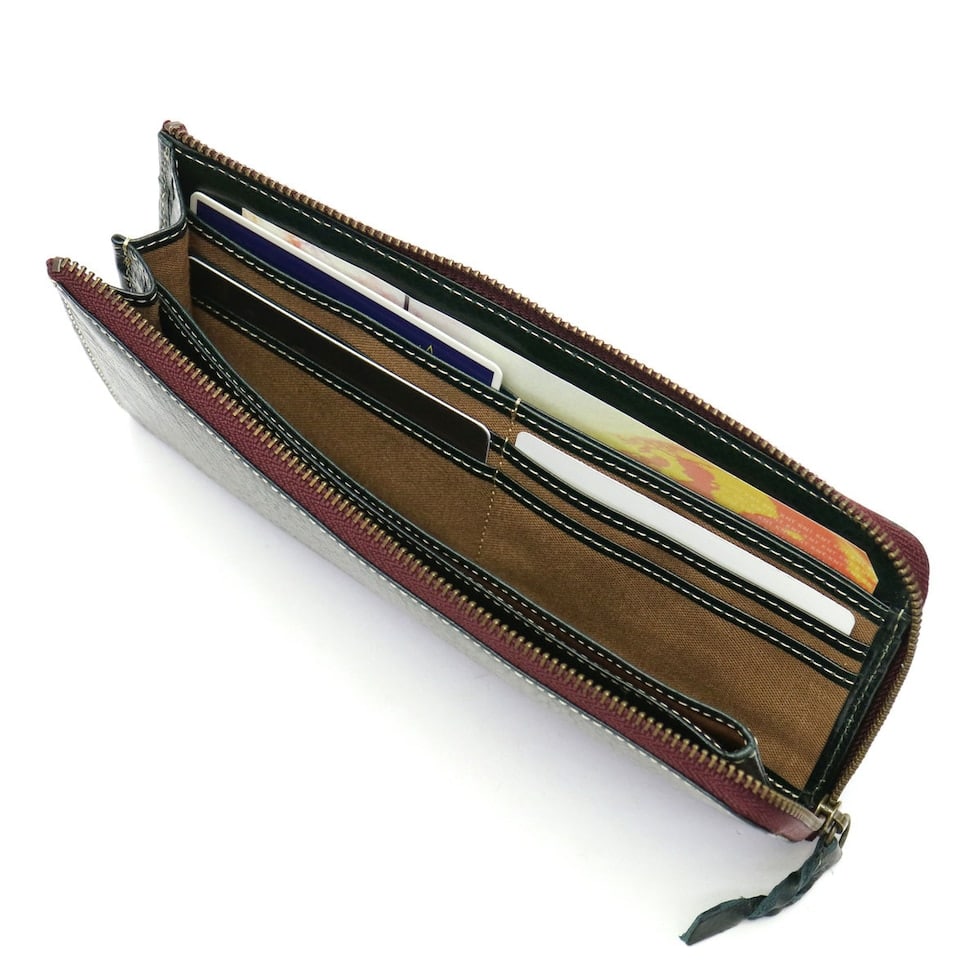 収納部は、カードポケットを12カ所と、レシートや領収書の収納に便利なフリーポケットを装備した充実のつくりとなっています。薄マチながら頼れる収納力と、バッグに入れても邪魔にならないスリムなサイズ感が魅力的。