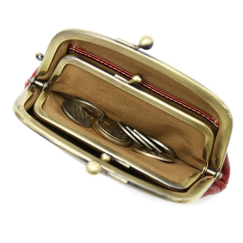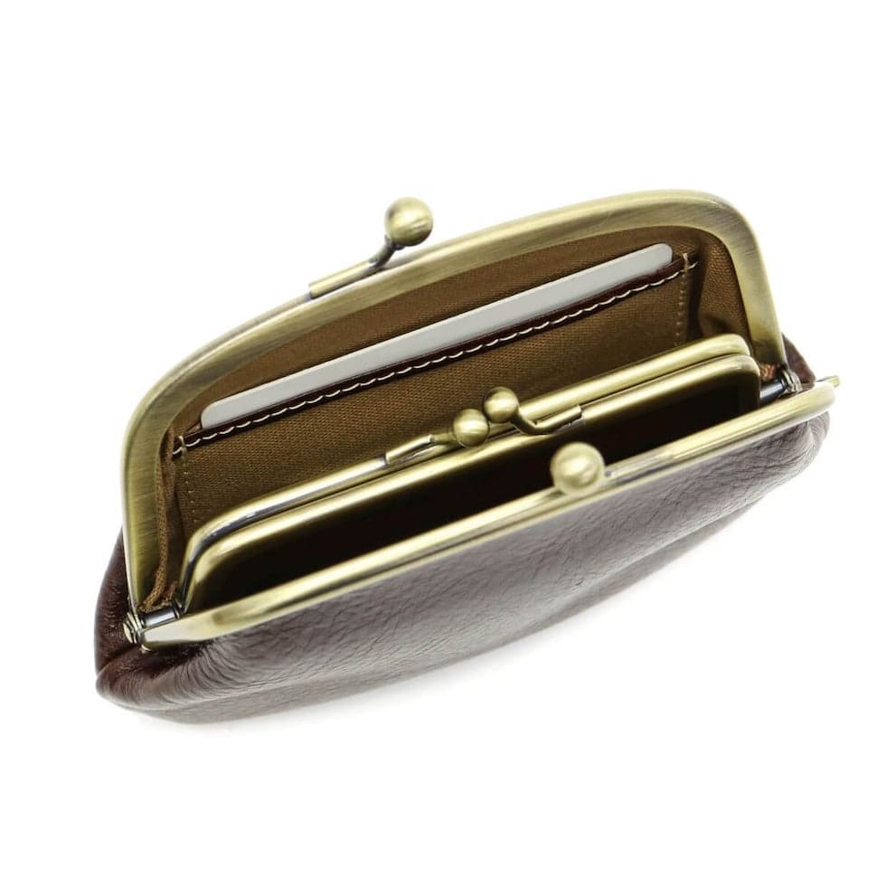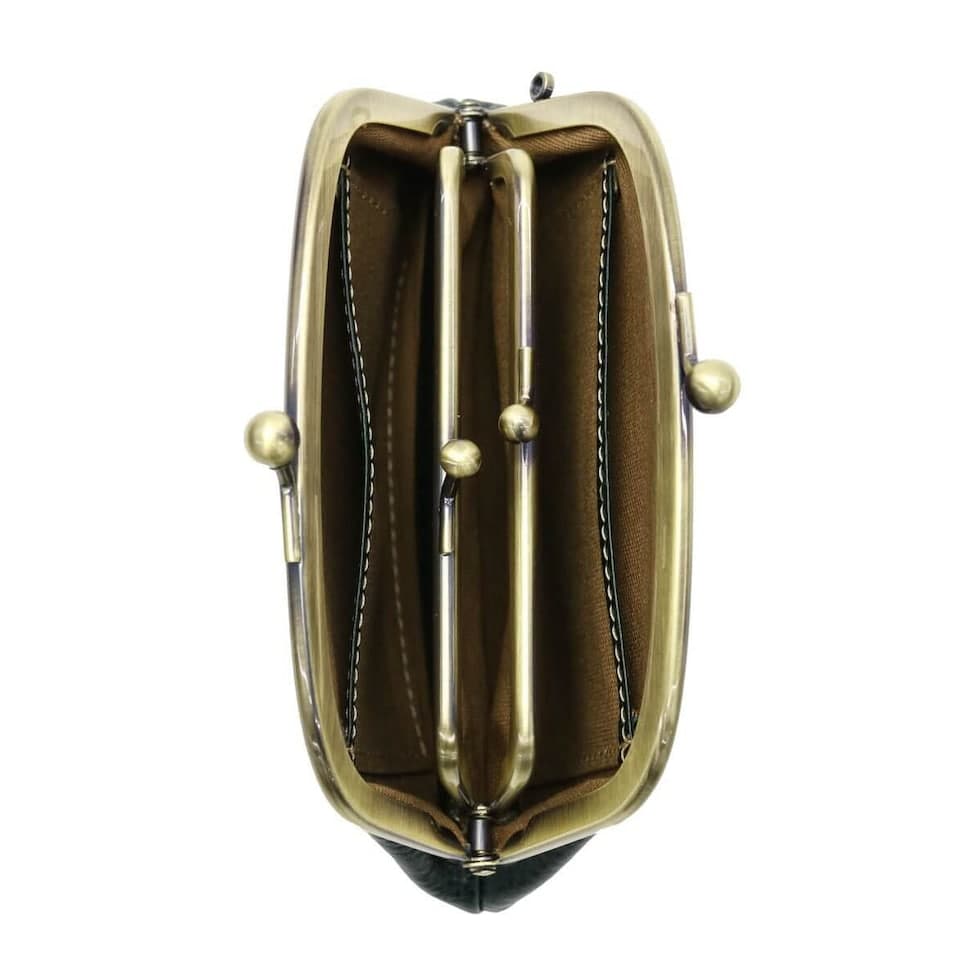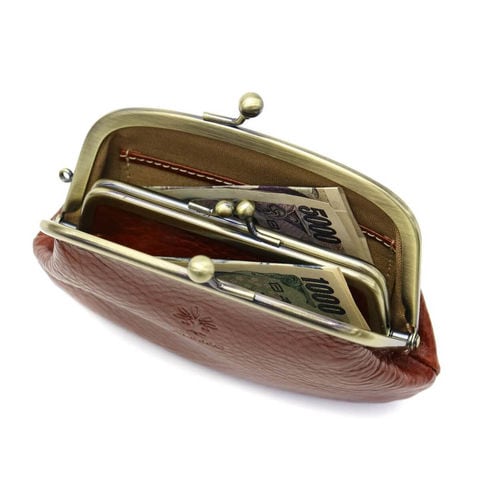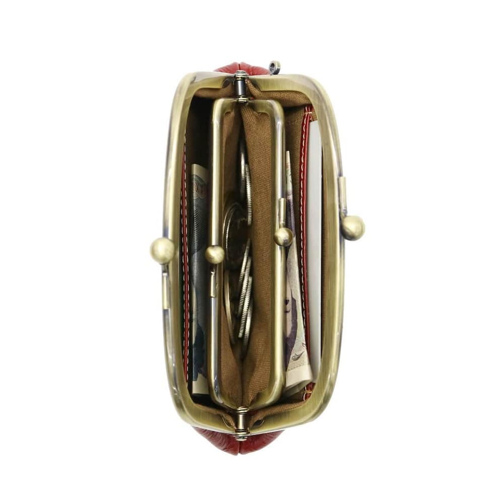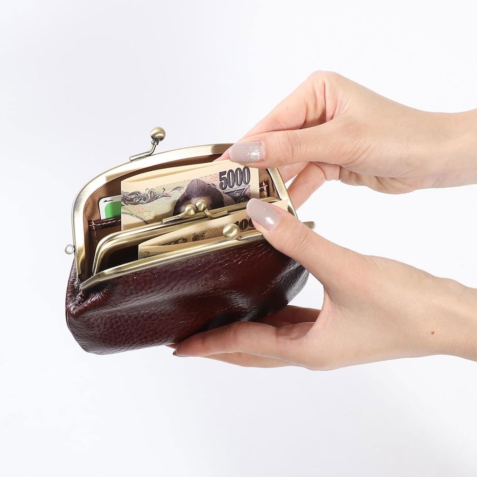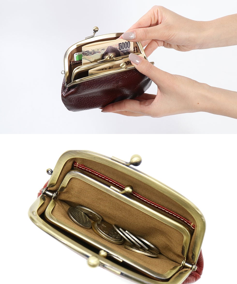 メイン収納部は使いやすい金口式。がま口を開くと、中にはさらに小さめのパースが現れる愛らしいデザインとなっています。内装には2カ所のカードポケットを装備し、必要最低限の収納ができるミニマムサイズが魅力です。使うほどに愛着が増すコンパクトな大きさで、サブウォレットとしてもオススメです。